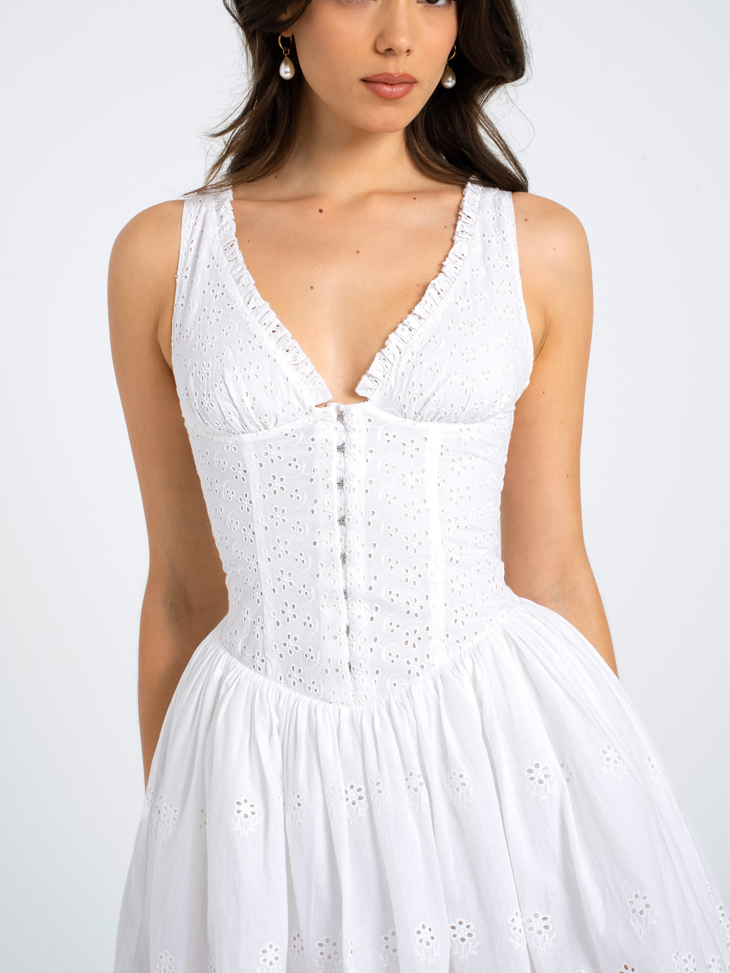 Step into sophistication with our Aaliyah mini dress. a masterpiece crafted from elegant eyelet eco-luxe fabric. This dress showcases a plunging halter neckline adorned with a pleated trim. exuding bold sophistication. and a contemporary drop waist design. The skirt is enhanced with customized trimming for a unique flair and layered with support for added structure. A built-in corset provides both comfort and a flattering fit. while an invisible zipper at the mid-back ensures a seamless finish. Perfect for any special occasion. this mini dress effortlessly combines classic charm with modern details. making it a standout choice for your wardrobe.