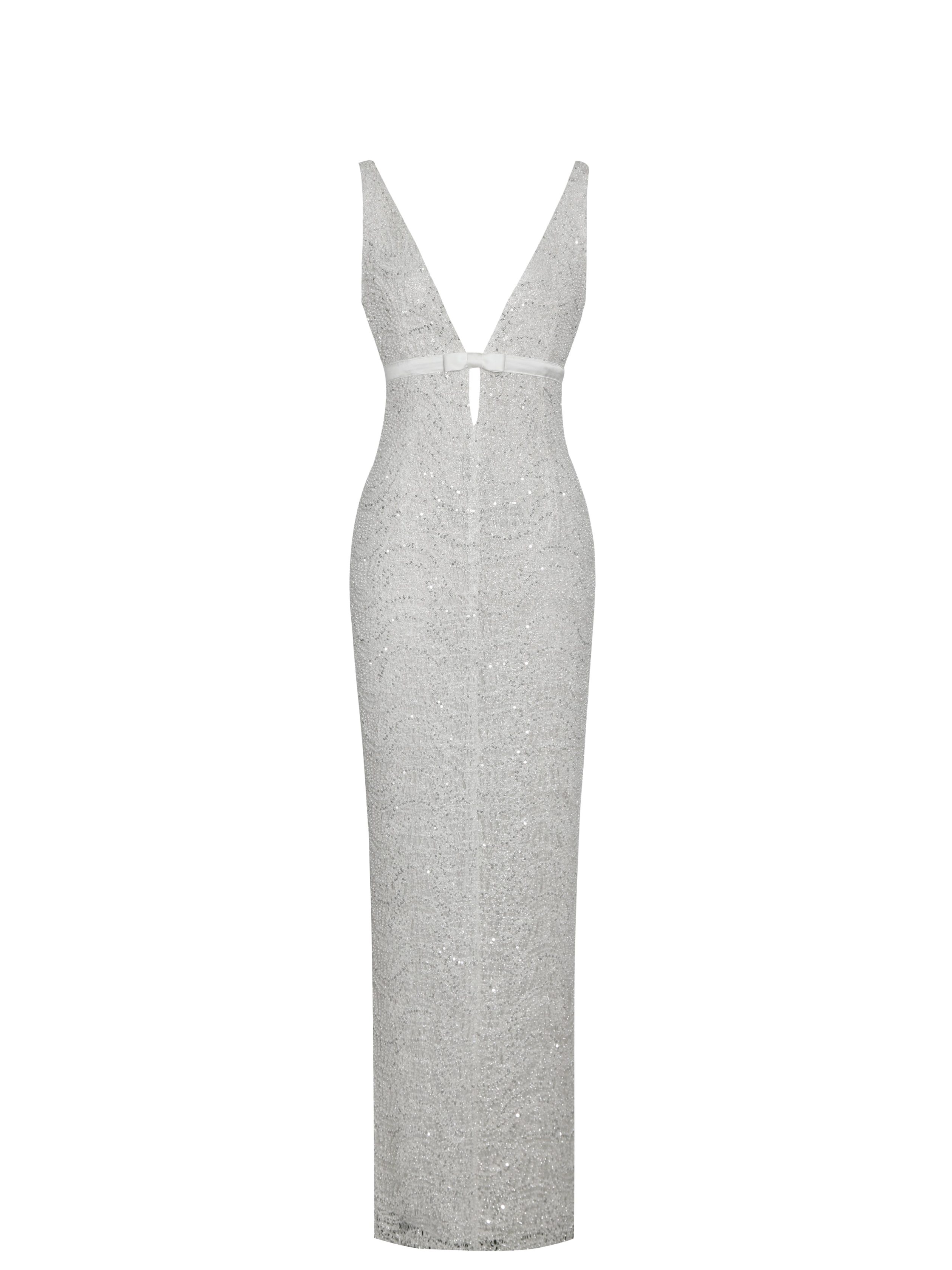 Glamour meets sophistication in the Adelaide Dress. a sleek silver pencil dress crafted from beaded sequin net that catches the light from every angle. The elegant V-shaped neckline is accented with a delicate satin mini bowtie. while the keyhole design adds a subtle touch of allure. With a stretchable fit. invisible zipper. and back slit for ease of movement. this fully lined dress is perfect for evening events where sparkle and style are a must.