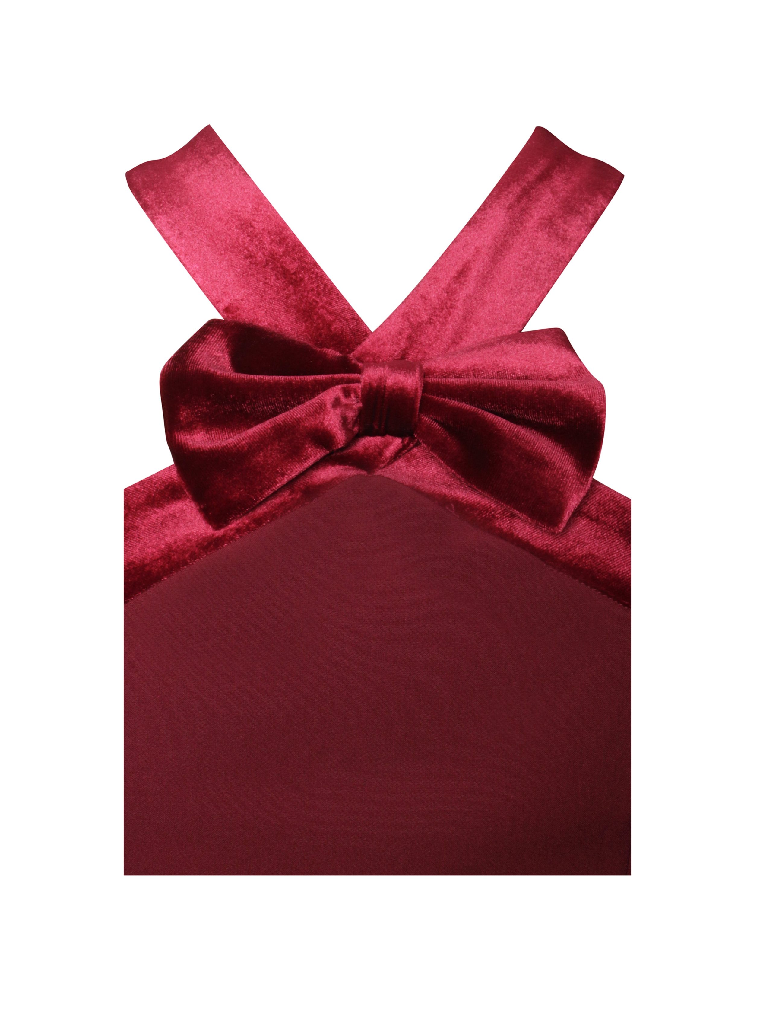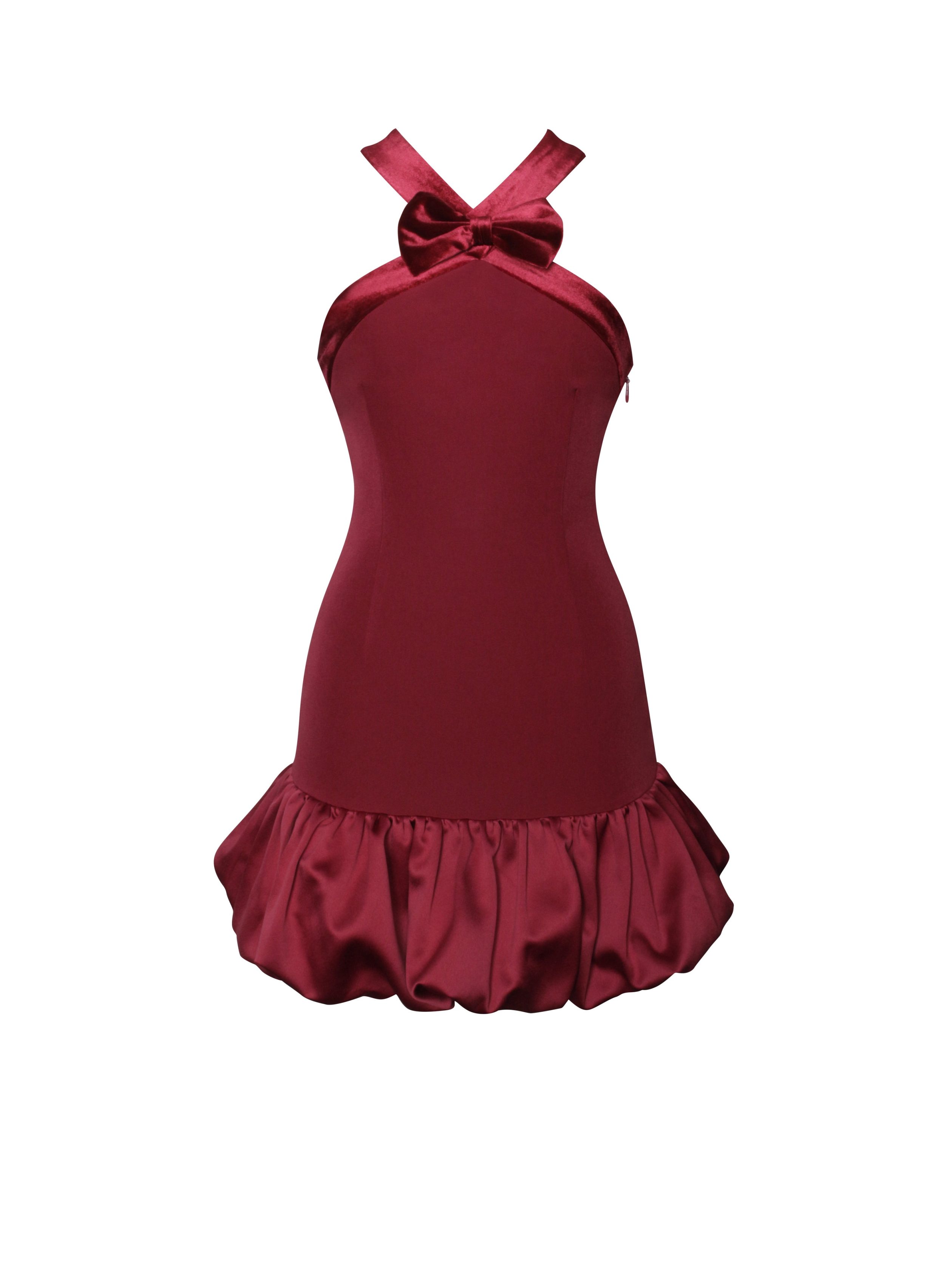 Introducing the Barbra Dress. a show-stopping piece designed to captivate. This striking red dress features elegant cross velvet shoulder straps that add a touch of luxury and sophistication. A charming velvet bowtie accentuates the neckline. enhancing the dress’s romantic allure. The hip-hugging silhouette highlights your curves beautifully. leading into a dramatic Double Duchess Luxe Satin bubble hem for a playful yet refined finish. An invisible zipper at the back ensures a seamless look. completing this fully polished design. Perfect for special occasions. the Barbra Dress is a bold choice for those who love to make an entrance.