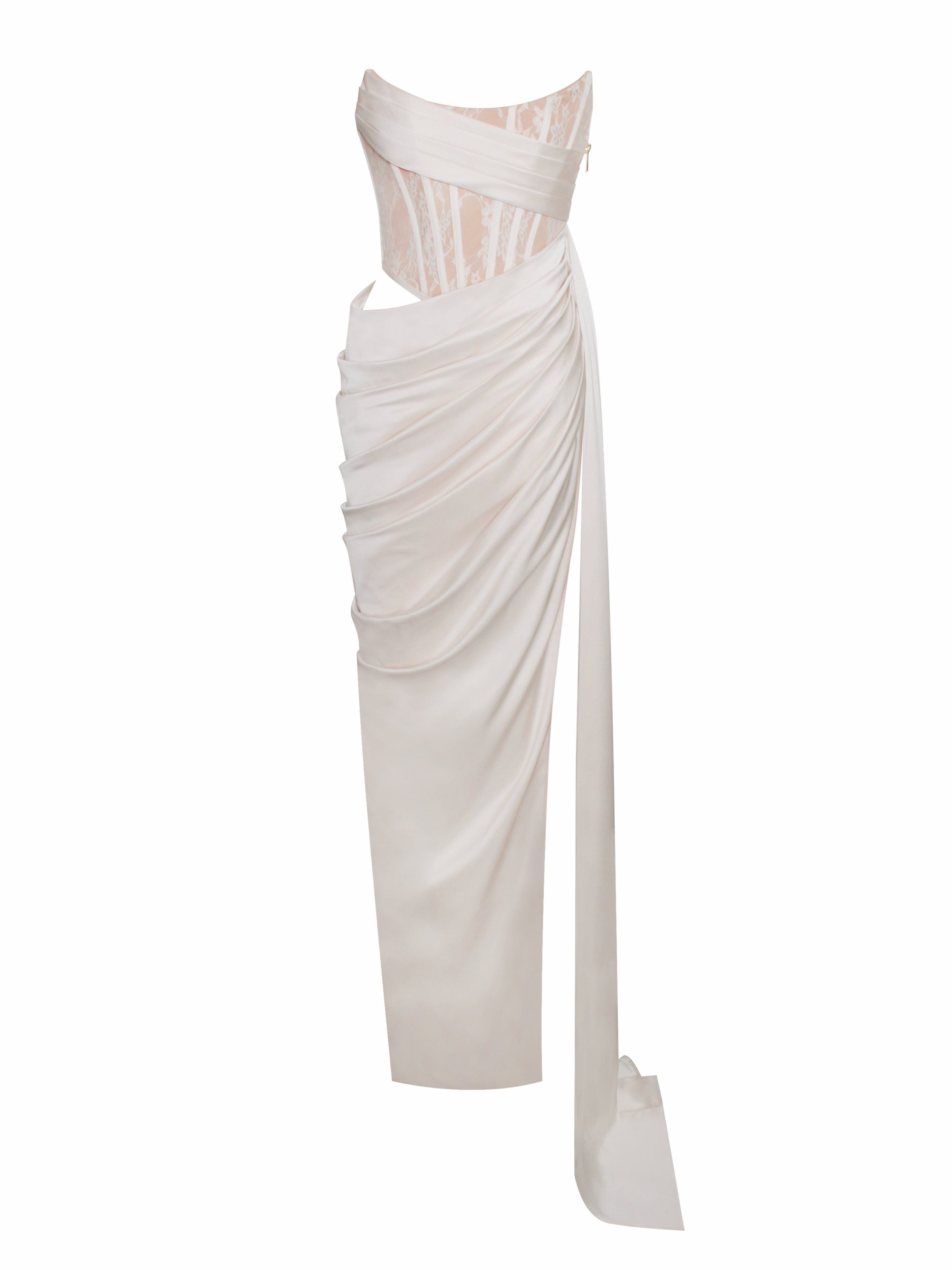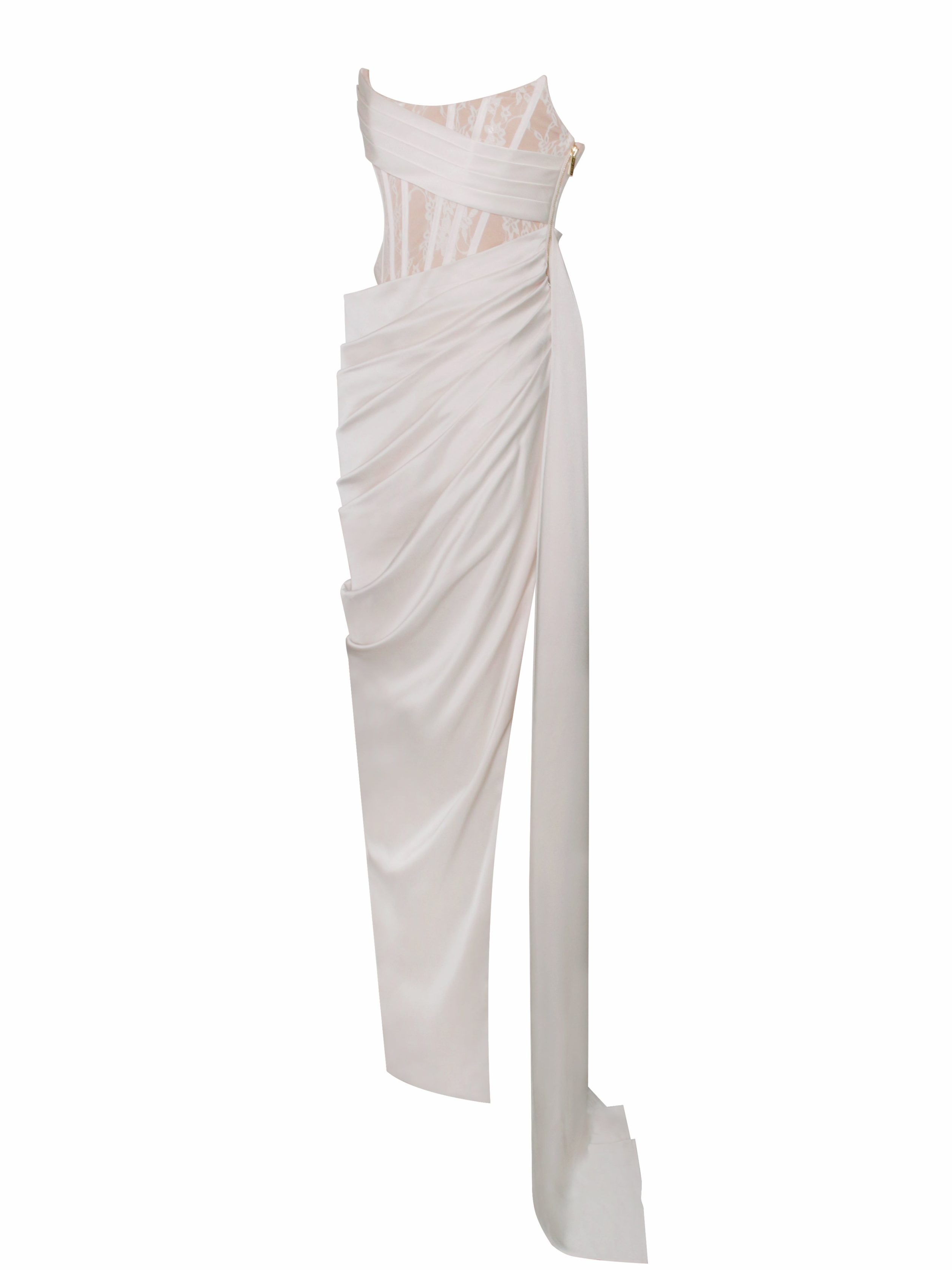 Callie Pearl White Lace Satin Corset High Slit Gown