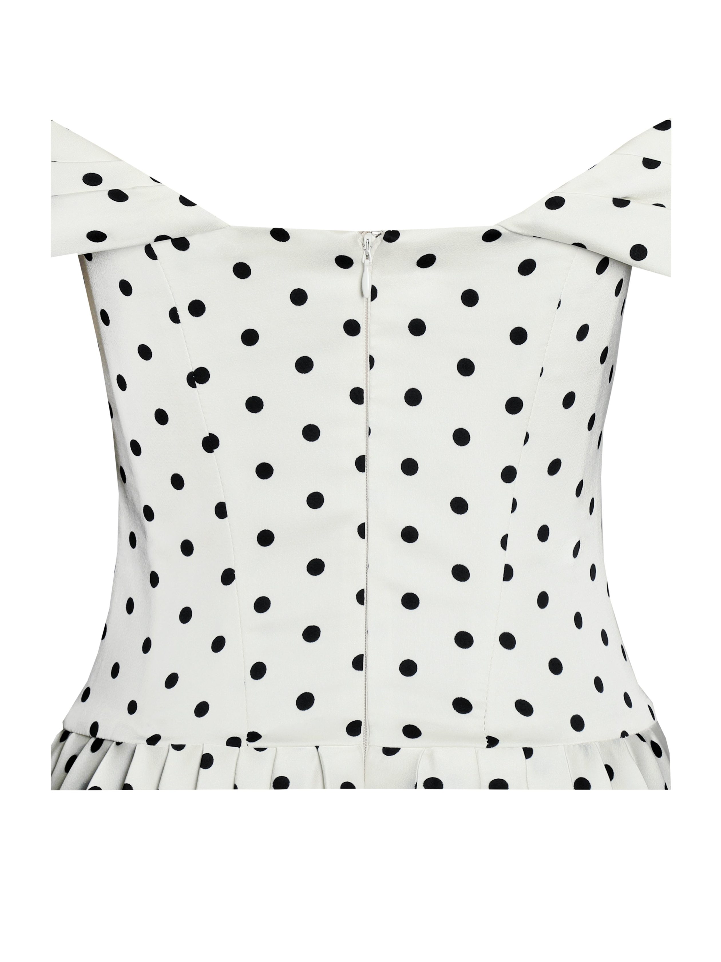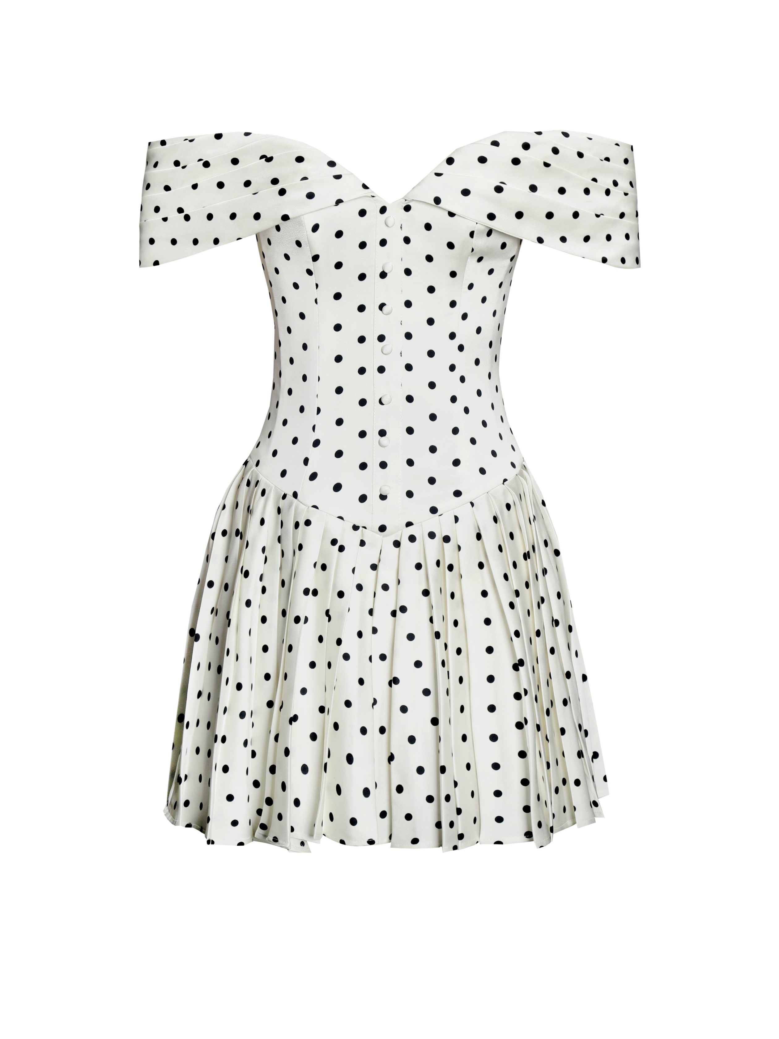 The Edeline Dress is a playful yet elegant piece. designed with a charming polka dot pattern that exudes vintage-inspired flair. Featuring an off-shoulder neckline and pleated sleeves. it brings a romantic touch to any look. The decorative buttons add a refined detail. while the pleated mini skirt and drop waist silhouette create a flattering and flirty shape. With built-in bones for structure and an invisible zipper for a seamless finish. this dress is a timeless addition to any wardrobe.