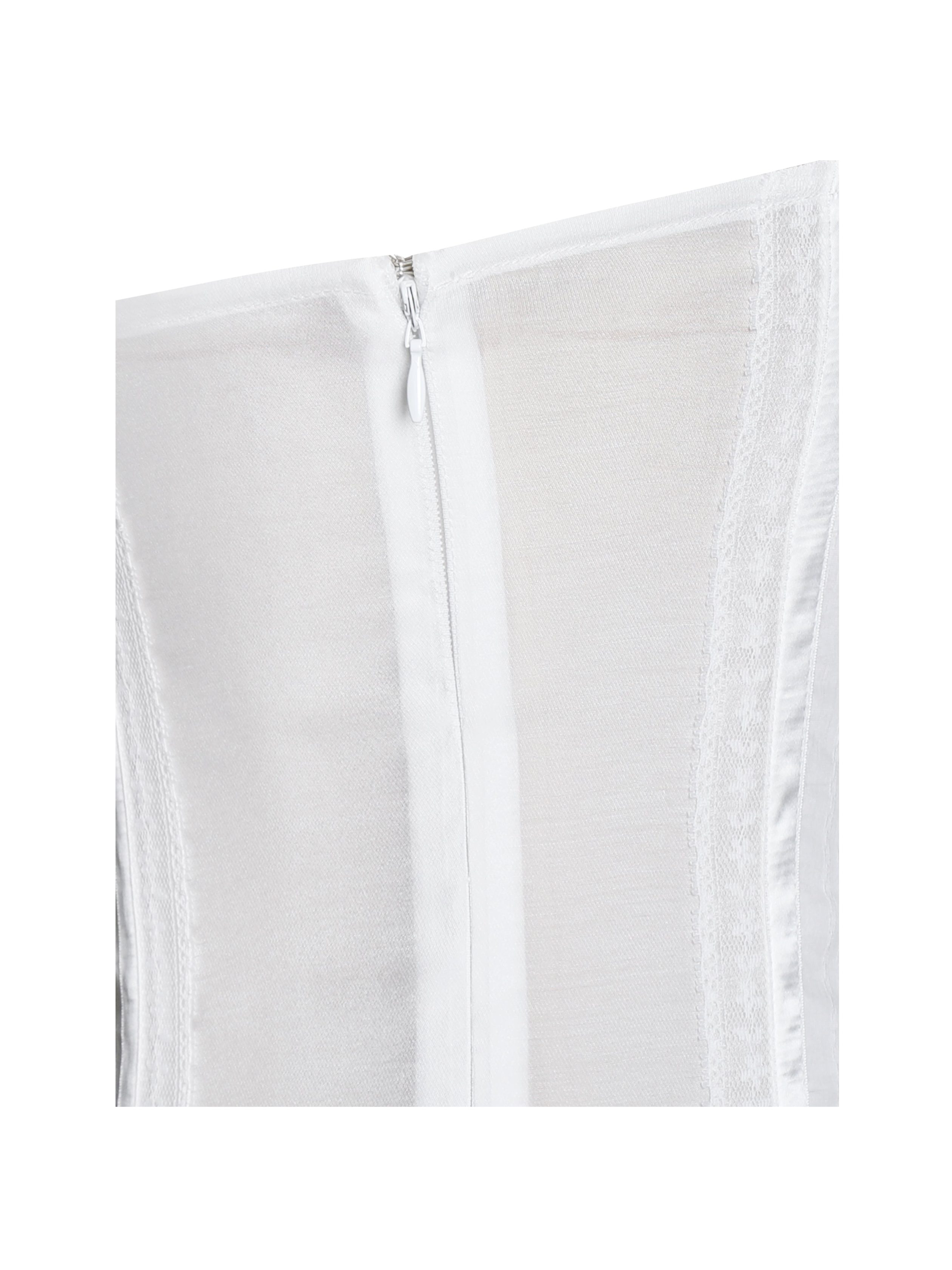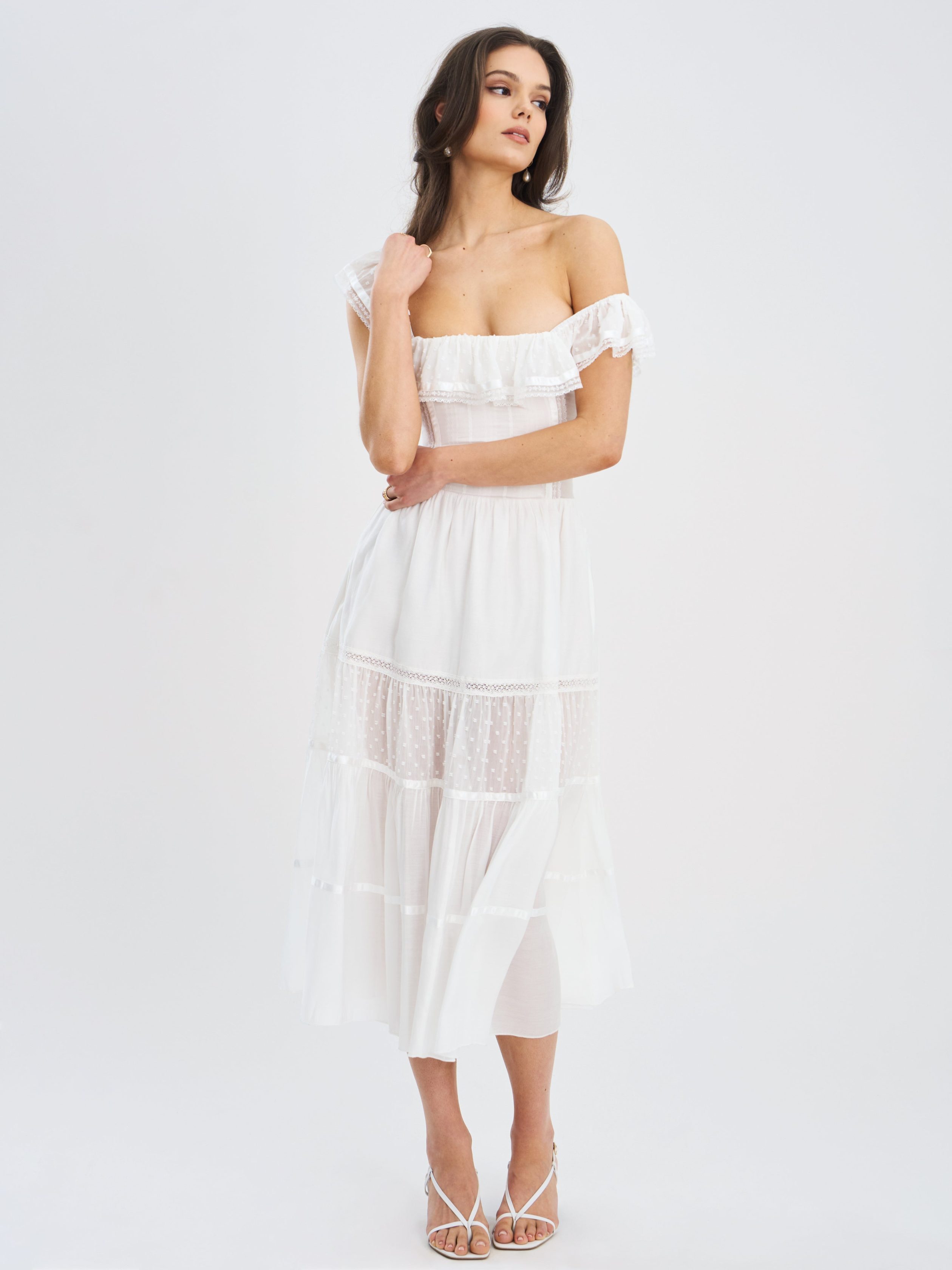 Step into timeless elegance with this romantic white midi dress. crafted in delicate Tencel and Chiffon with subtle dotted textures and intricate lace trims. The square neckline is framed by a charming ruffled flounce. adding a touch of femininity and softness to the structured bodice. Designed with a flattering fitted waist and a full. tiered skirt. this dress balances grace and comfort effortlessly. Fully lined for ease of wear. it’s a dreamy choice for picnics. garden parties. or warm-weather getaways.