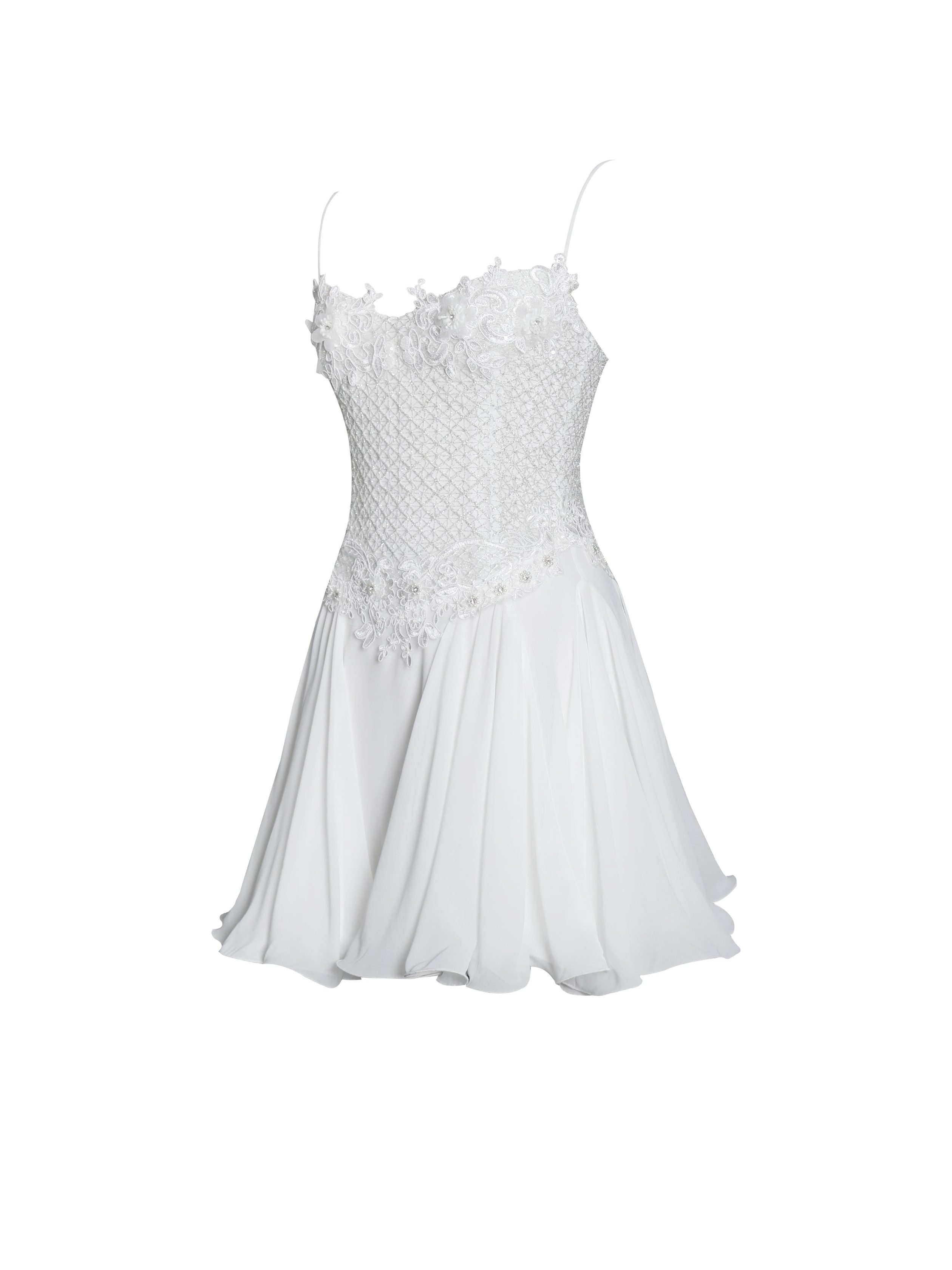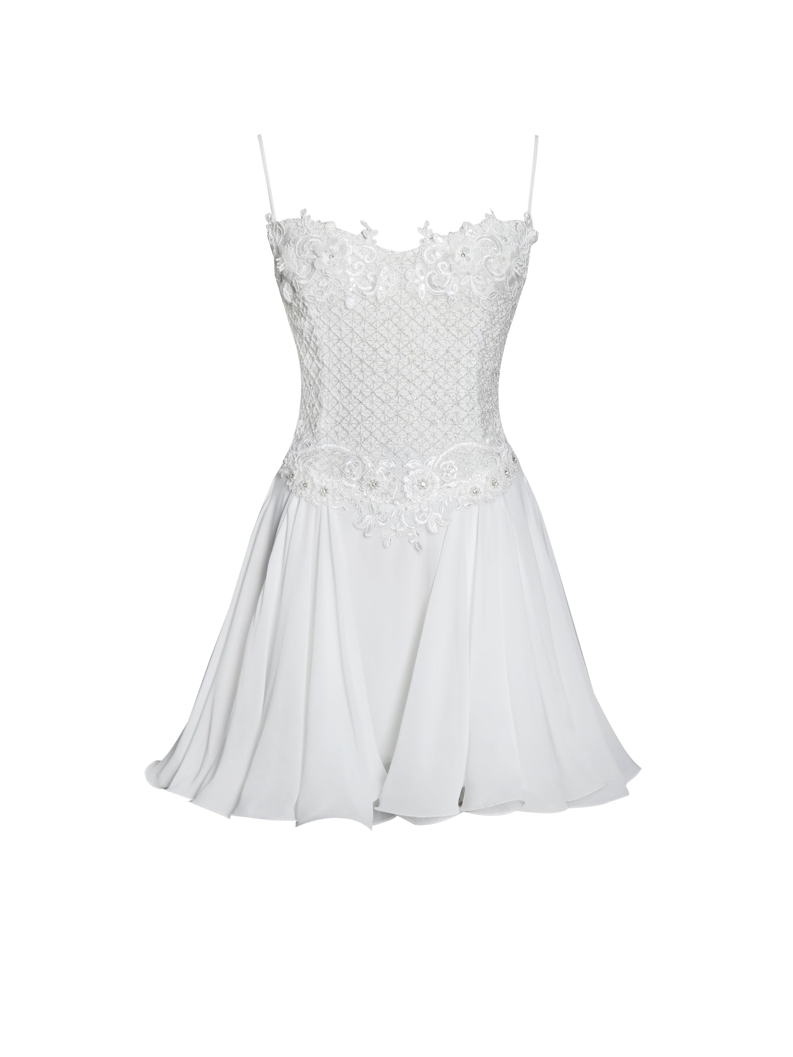 Delicate yet striking. the Fabiola Dress is a mini masterpiece designed to enchant. Crafted from airy silver net and flowy chiffon. it features intricate beaded embroidery lace trims at the breast and waist for a touch of glamour. The drop waist silhouette is accentuated by built-in bones for structure. while the curve-edge hem—reinforced with built-in wire—adds graceful volume and movement. Finished with adjustable straps and an invisible zipper for a seamless fit. Fabiola is perfect for special occasions where elegance meets modern flair.