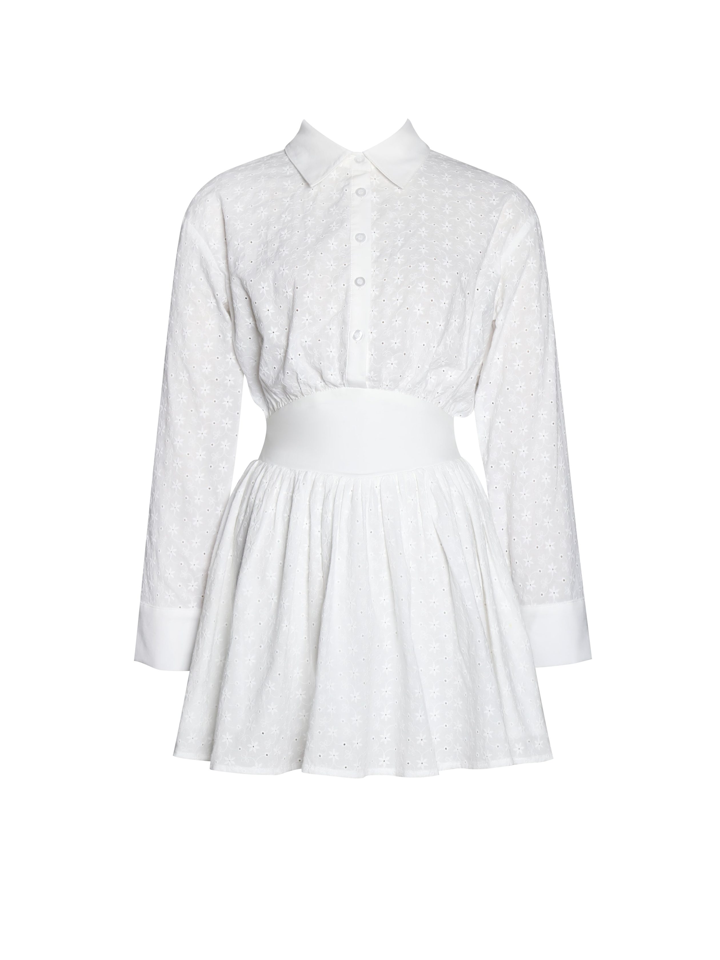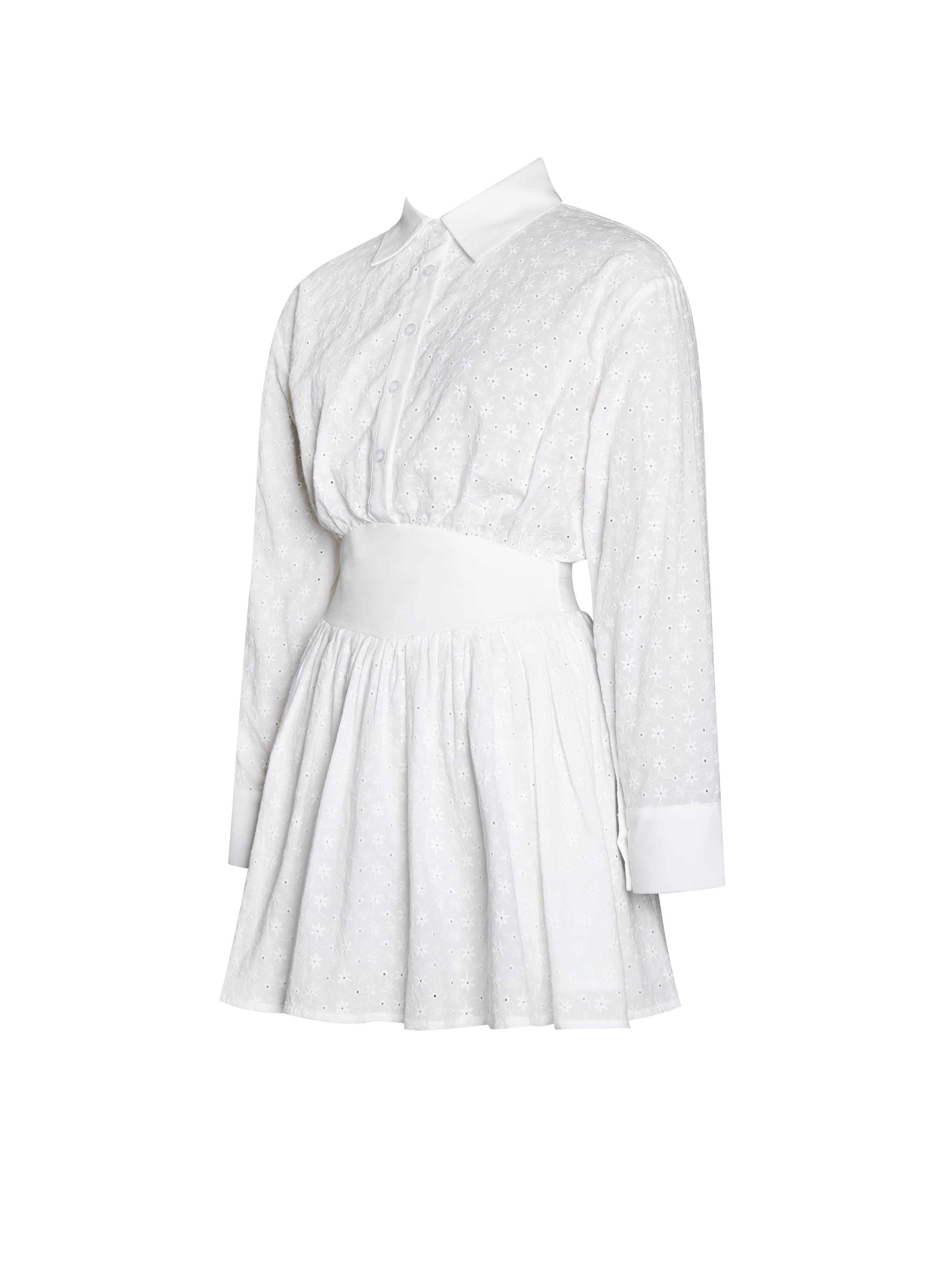 Introducing the Gabriella dress. a stylish eco-luxe long-sleeve mini shirt dress designed wiht cotton eyelet fabric for both comfort and elegance. The loose-fitting top features a sophisticated long cuff with three buttons. adding a refined touch. The corset waist creates a flattering silhouette and adds a hint of romance. An invisible side zipper ensures a seamless fit. enhancing the dress’s sleek look. Perfect for any occasion. this dress combines casual charm with chic details. making it a versatile addition to your wardrobe.