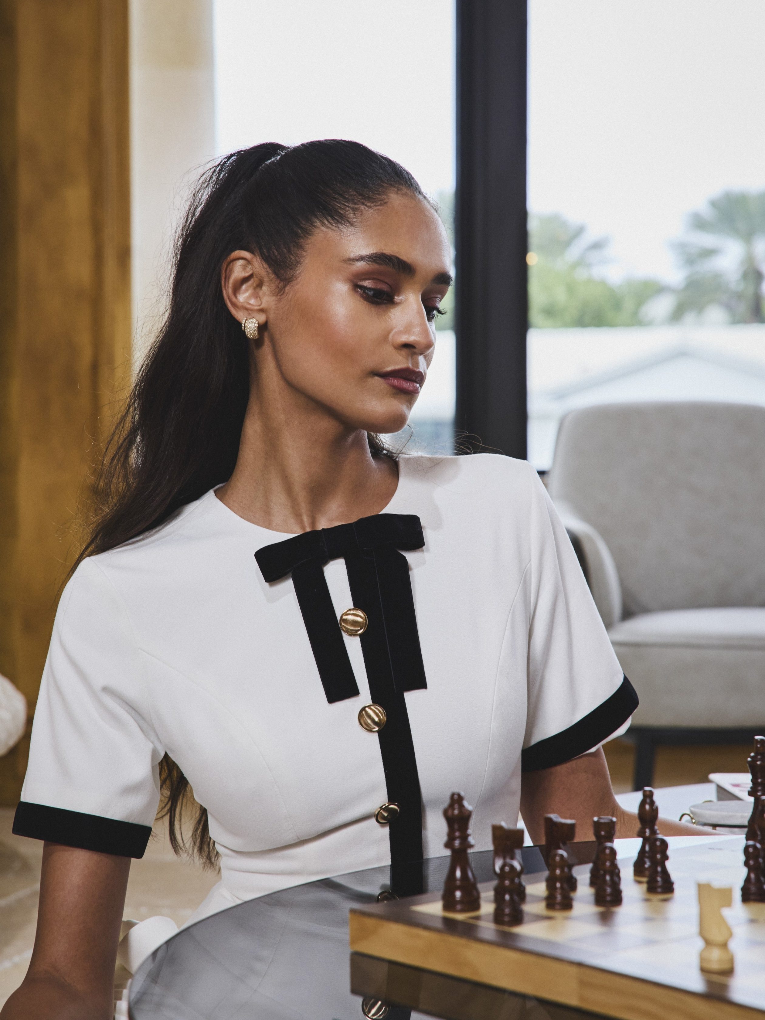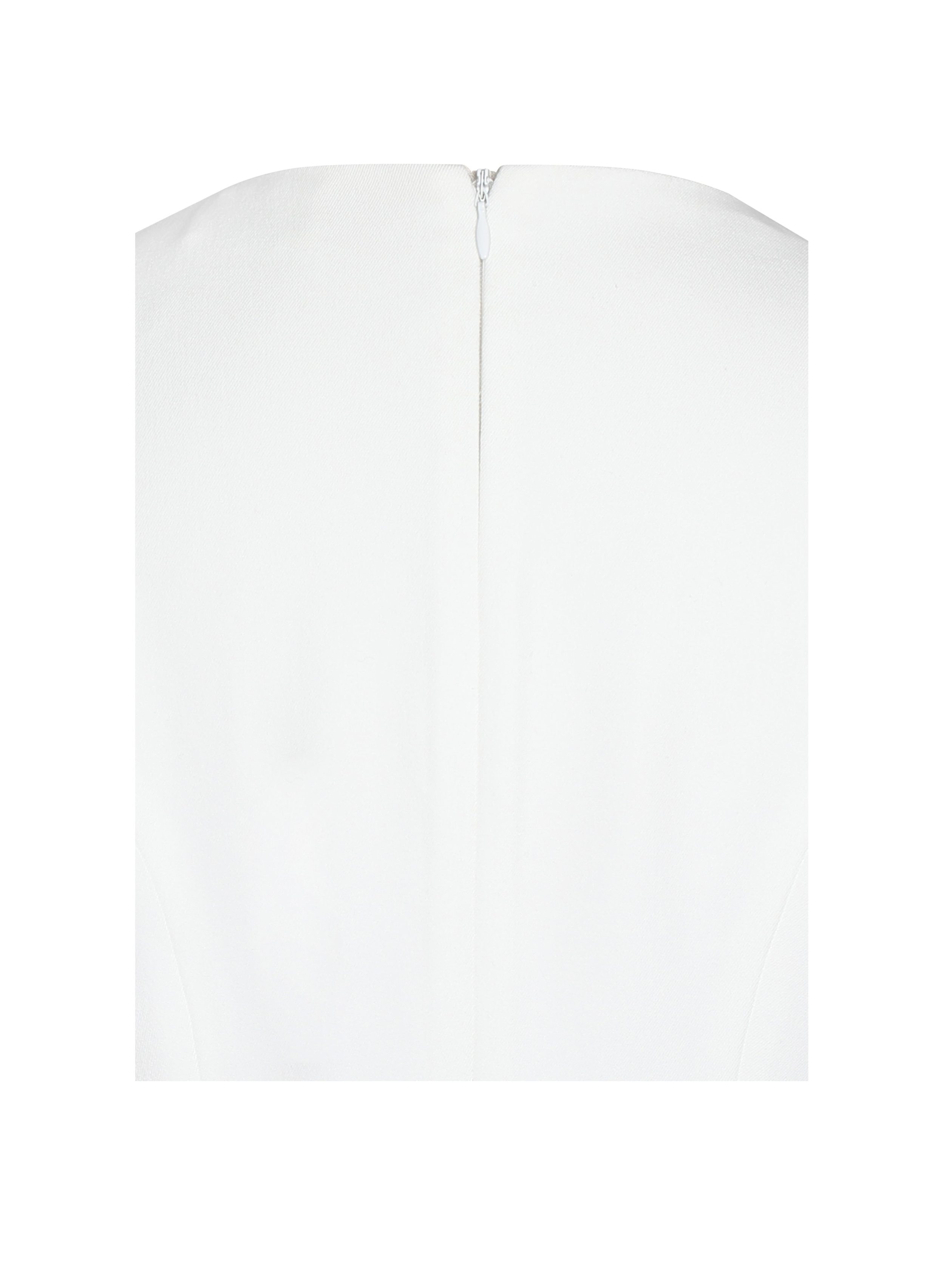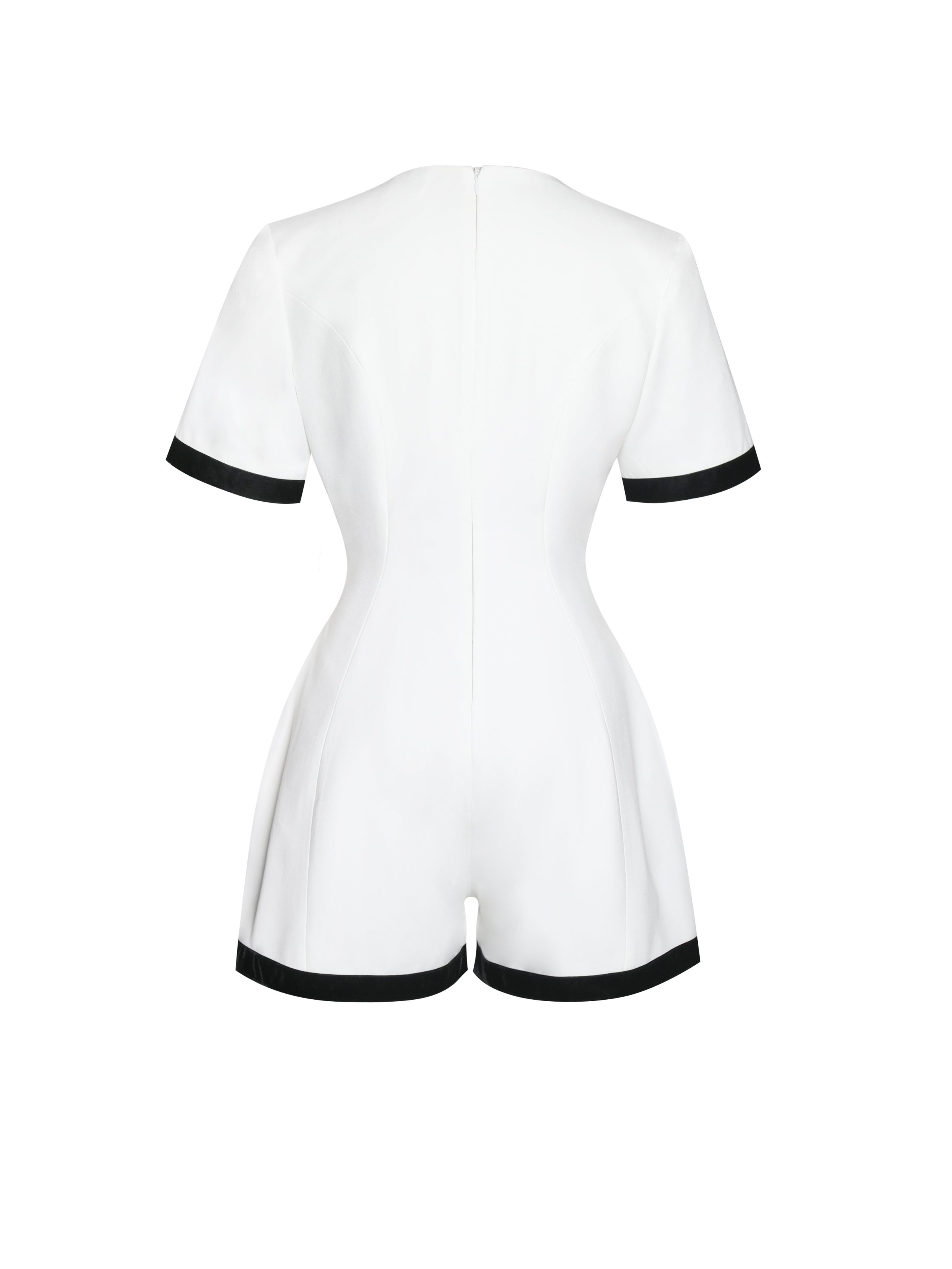 The Idina Romper is a sophisticated blend of business casual elegance and modern charm. perfect for spring picnics. daily wear. or formal events. Crafted from white crepe with black velvet trim. this chic piece features a timeless crew neck and short sleeves accented by gold buttons for a touch of luxury. The wide leg design creates a flattering silhouette. while invisible pockets add functionality. An invisible zipper ensures a seamless fit. making the Idina Romper a versatile staple for any occasion.