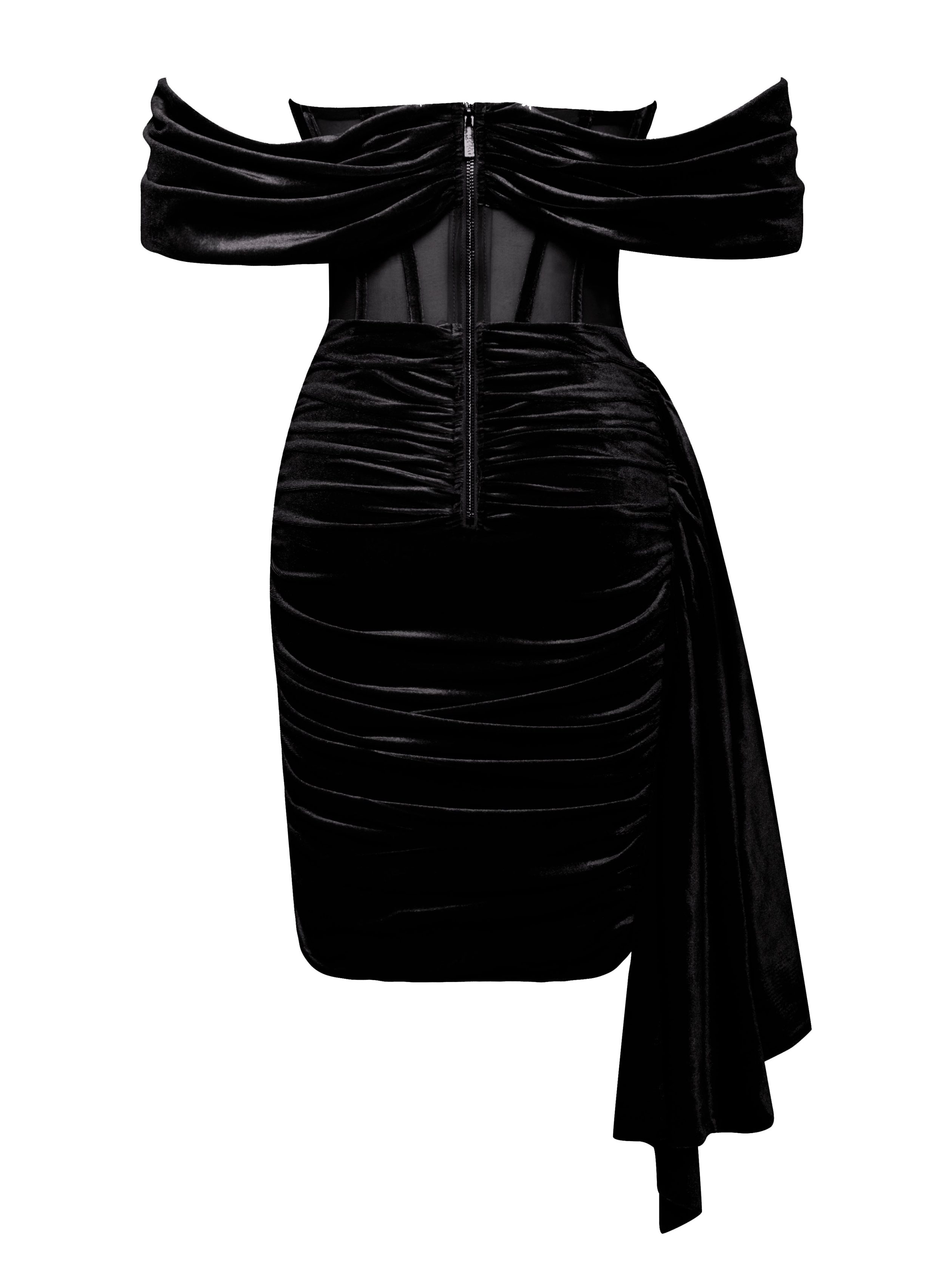 This sexy velvet mini dress boasts draping off-the-shoulder sleeves. enhancing your allure. The mini skirt is beautifully ruched to perfection. accentuating your natural curves. Irisa features a sheer stretch mesh fully boned corset with velvet-covered boning for figure-flattering support. A mid-length draping gracefully falls off the wearer’s left hip. adding a touch of flare. Complete with an invisible zipper at the center back. this dress is both sultry and sophisticated. Irisa is the perfect choice for making a statement at any special occasion. Match with our  (sold separately) to complete the look. Find Irisa in a from black. burgundy. gold. and teal blue.
