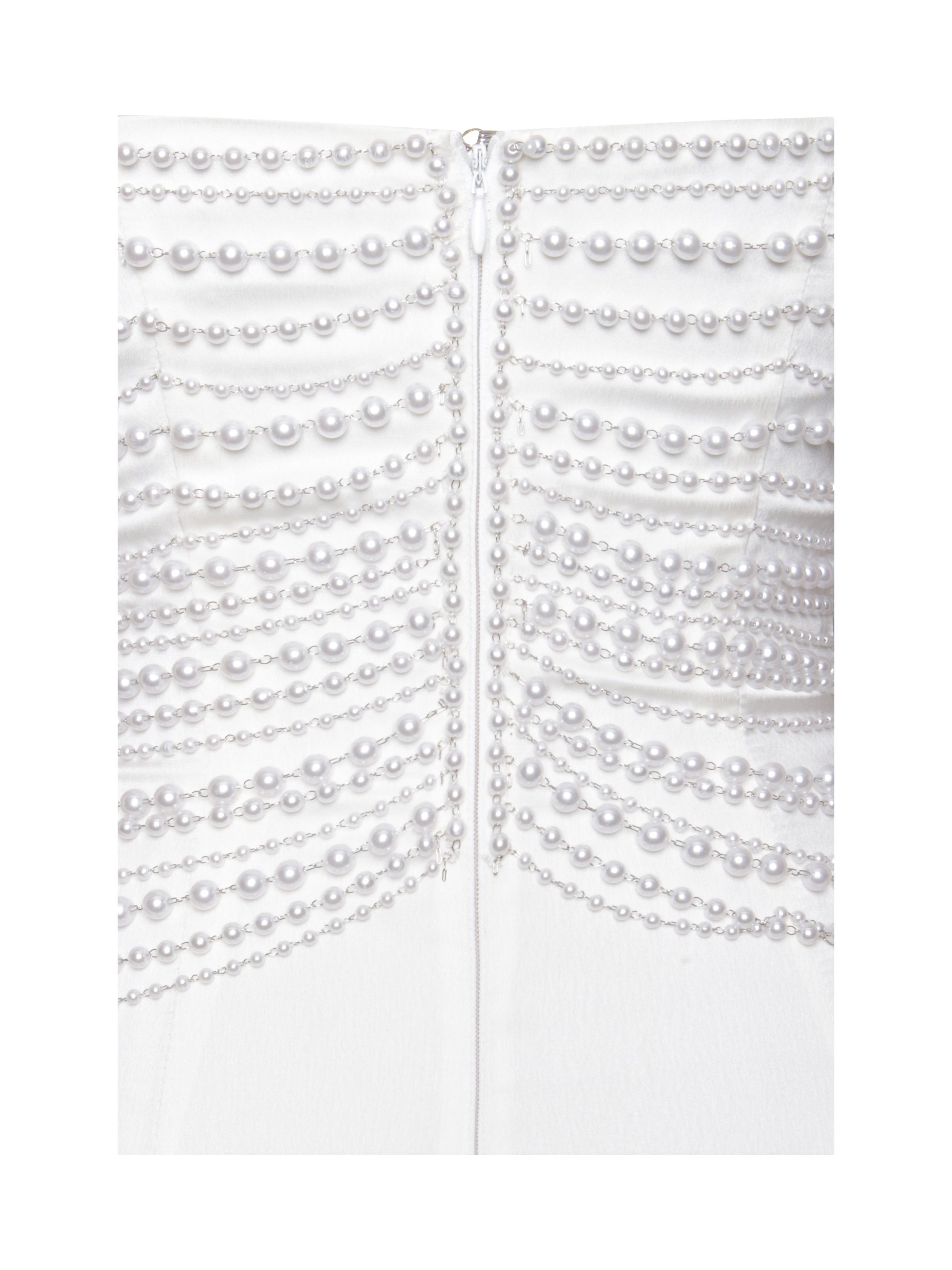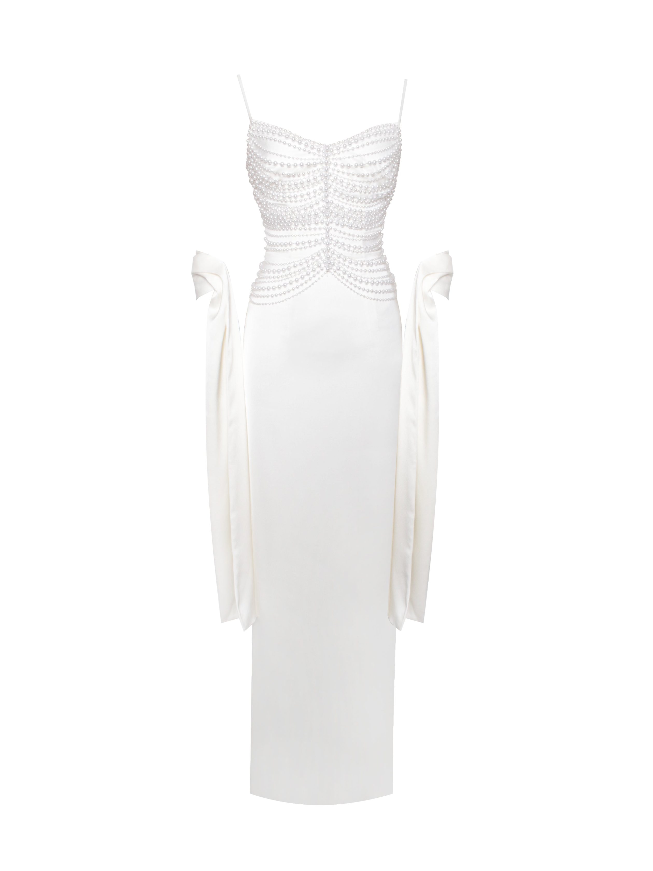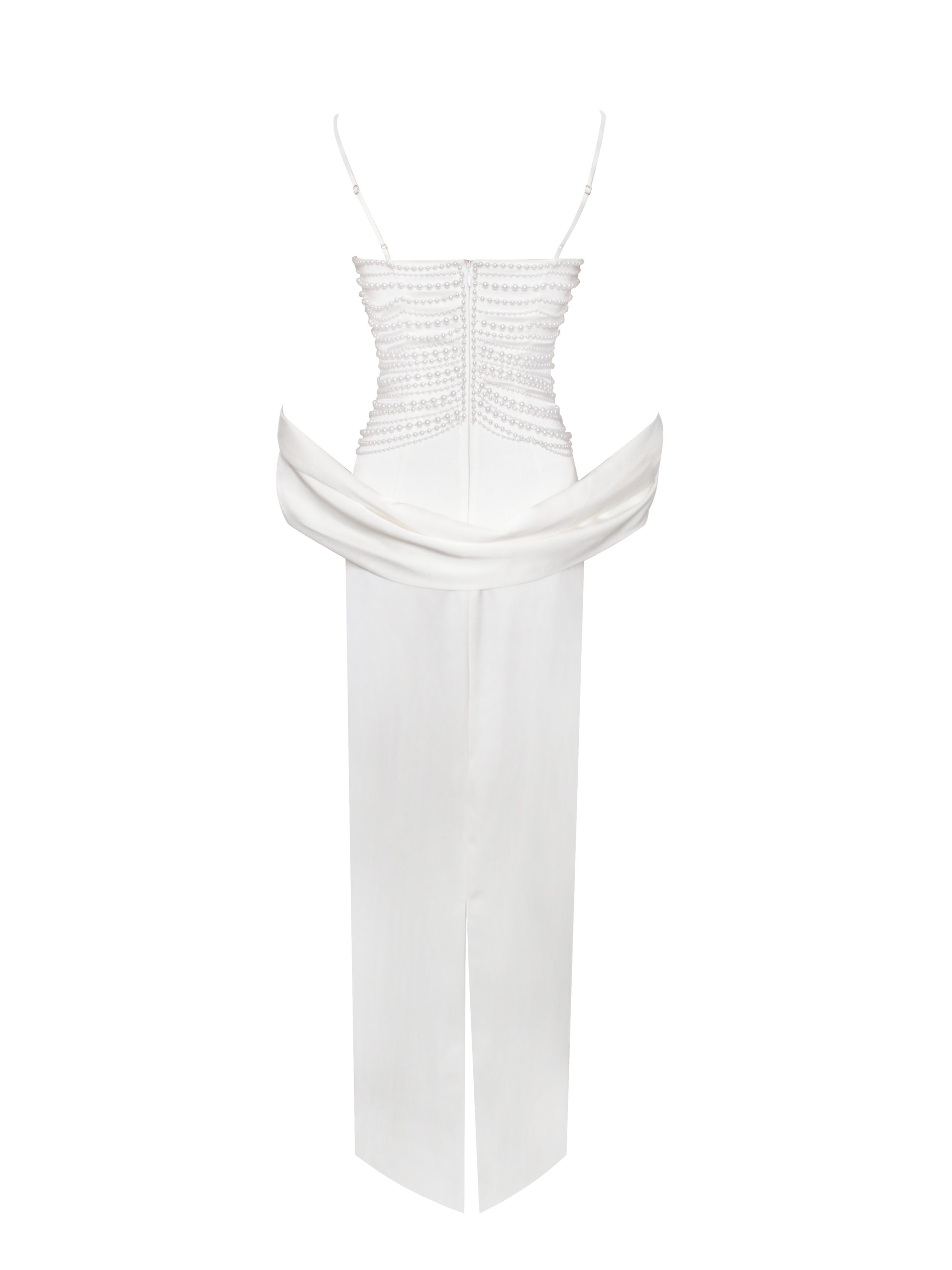 Introducing the Karmen Dress. a vision of timeless elegance in pearl white satin. This sleeveless straight slip dress features adjustable straps for a customizable fit. while the decorative pearl chain top adds a touch of luxury and sophistication. A back slit enhances movement and allure. complemented by an invisible zipper for a seamless look. Pair it with the matching pearl white long scarf for a cohesive and graceful ensemble. perfect for making a refined statement at any occasion.