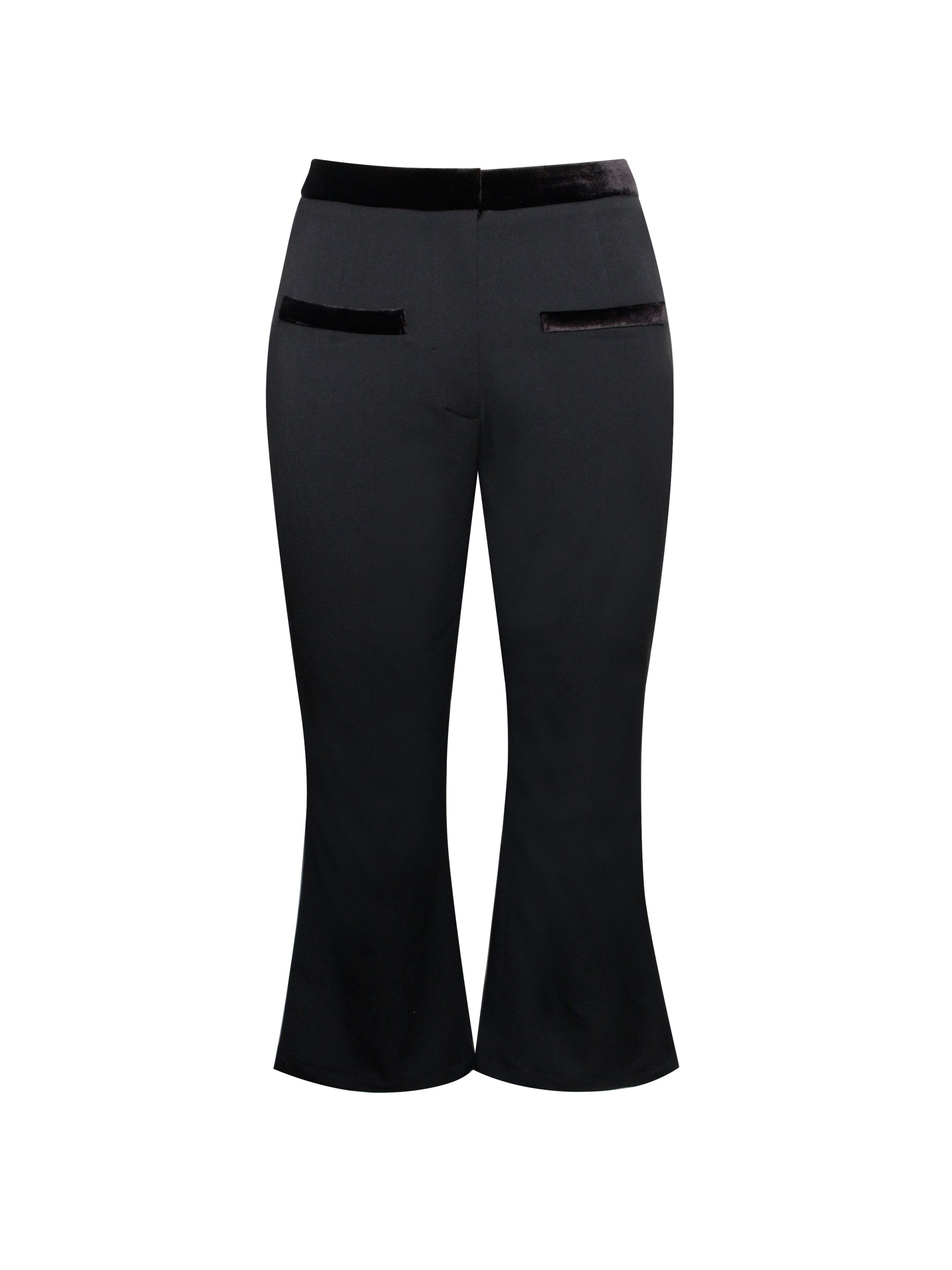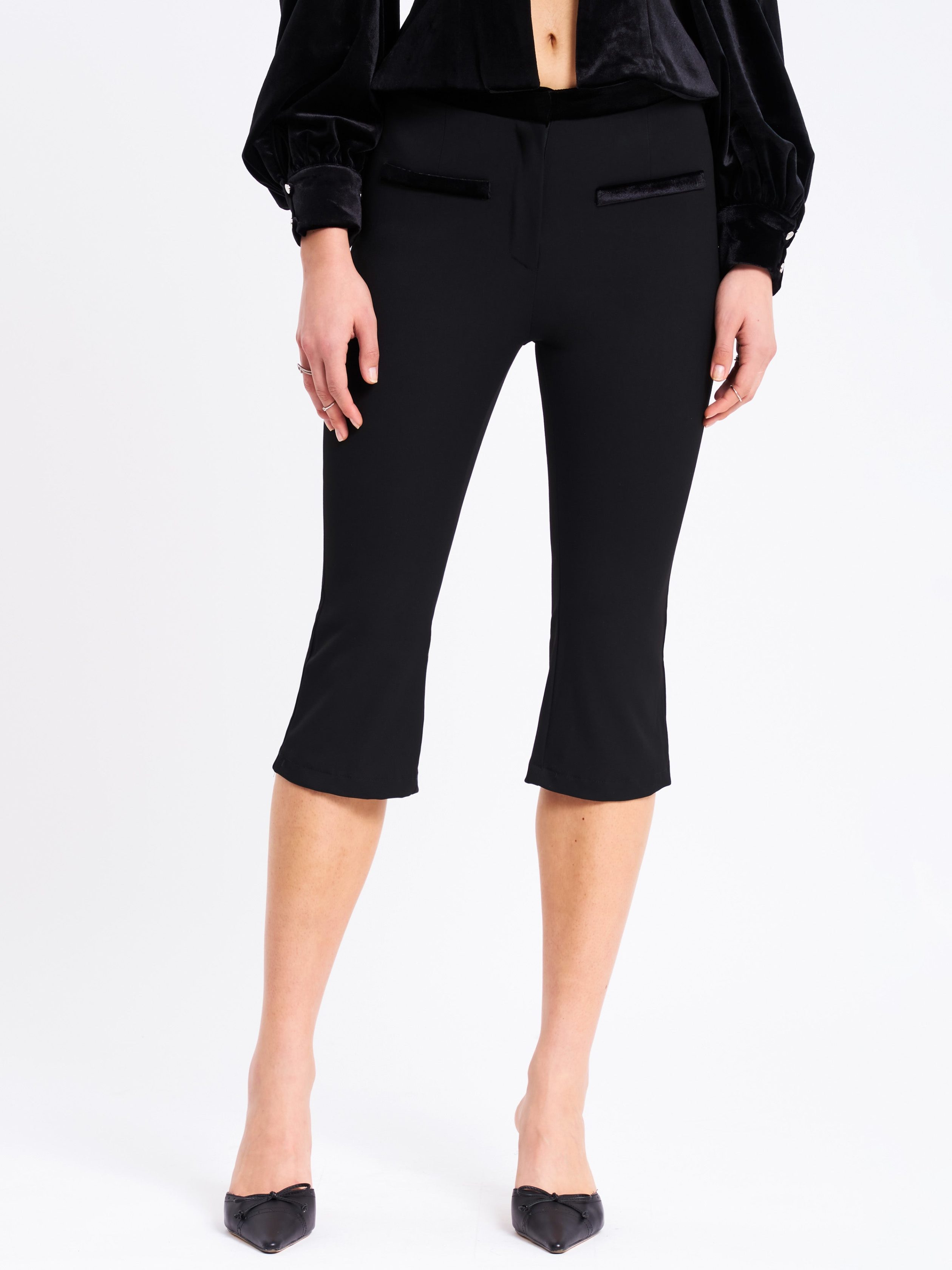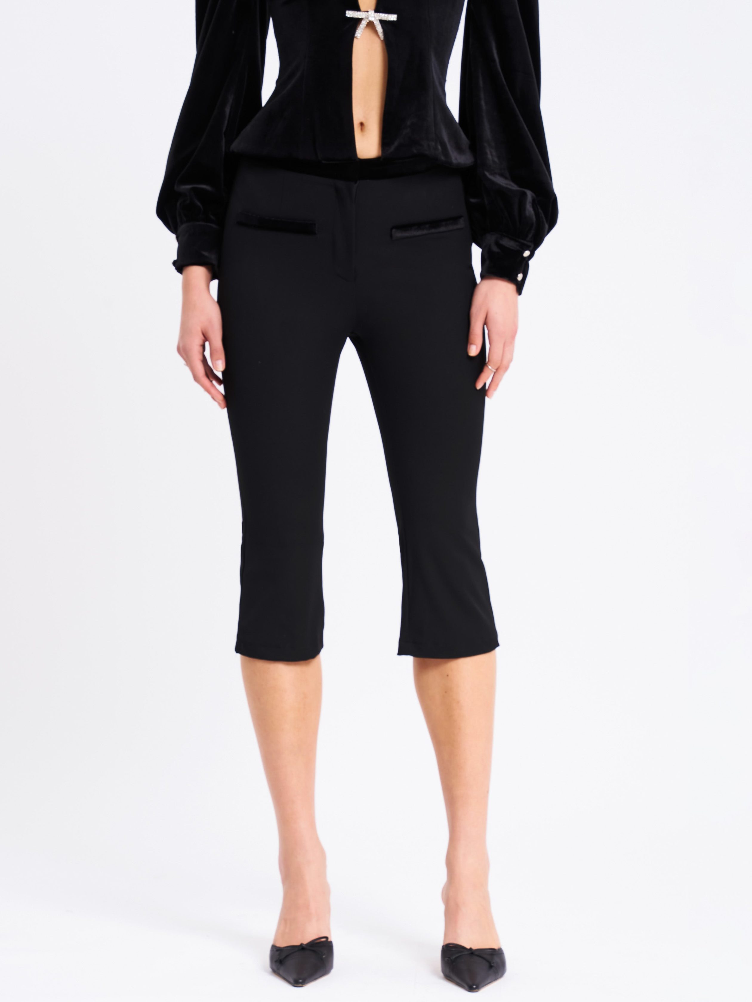 Introducing the Kristy Pants. a chic and stylish addition to your wardrobe. These low-rise cropped pants feature a flattering bodycon fit that hugs your curves and flares gracefully at the hem for a bold. modern silhouette. The velvet waistband and velvet decorative pocket trim add a touch of luxury. elevating the overall design. Perfect for pairing with statement tops like the . the Kristy Pants are a must-have for any fashion-forward look.