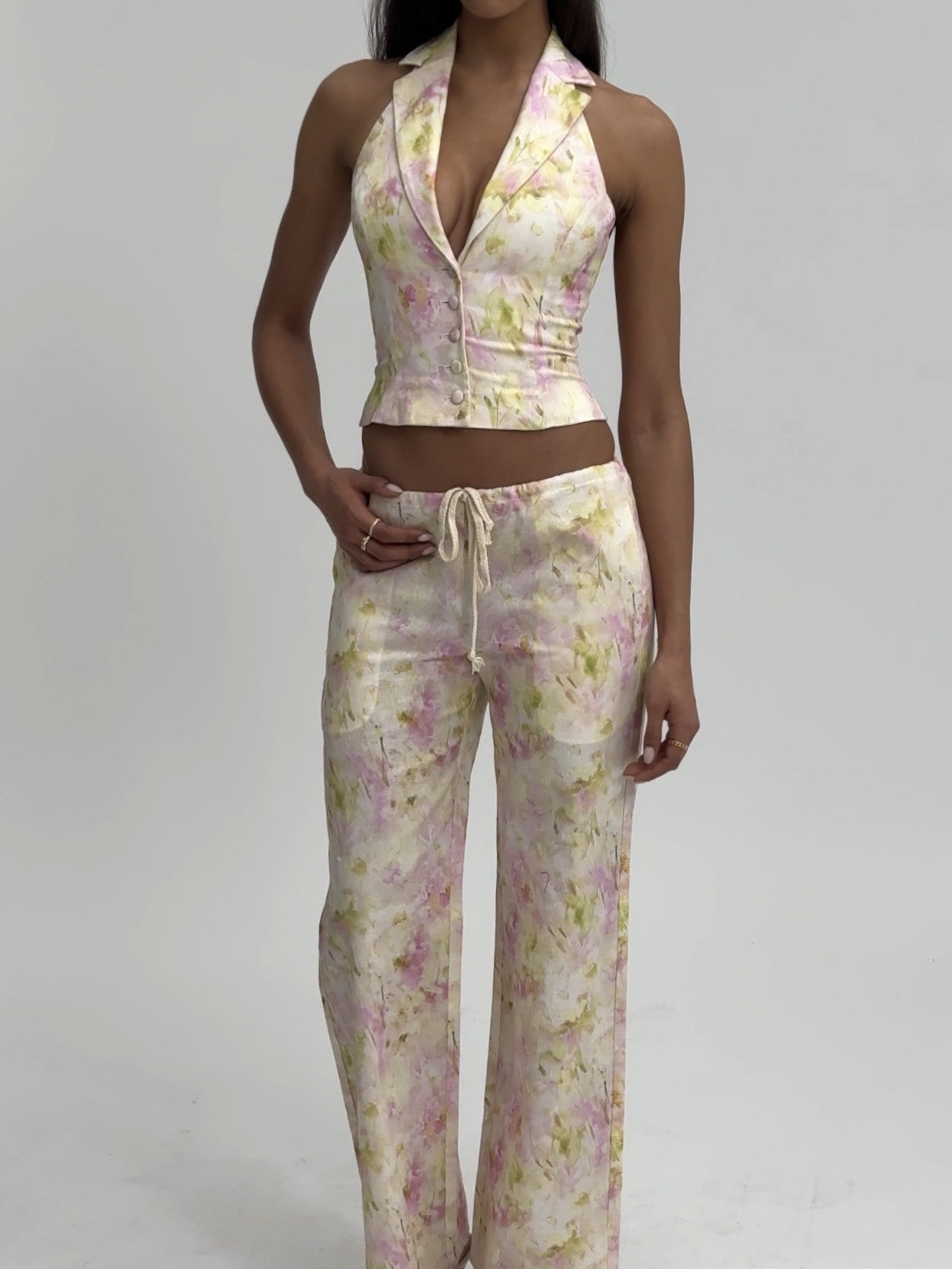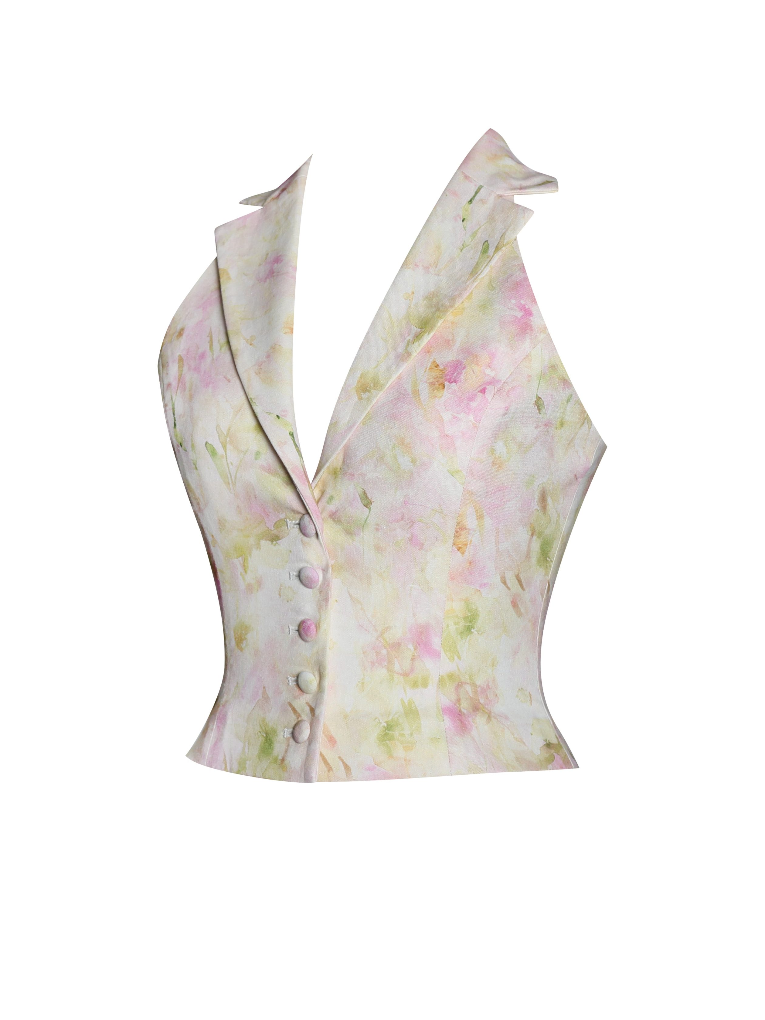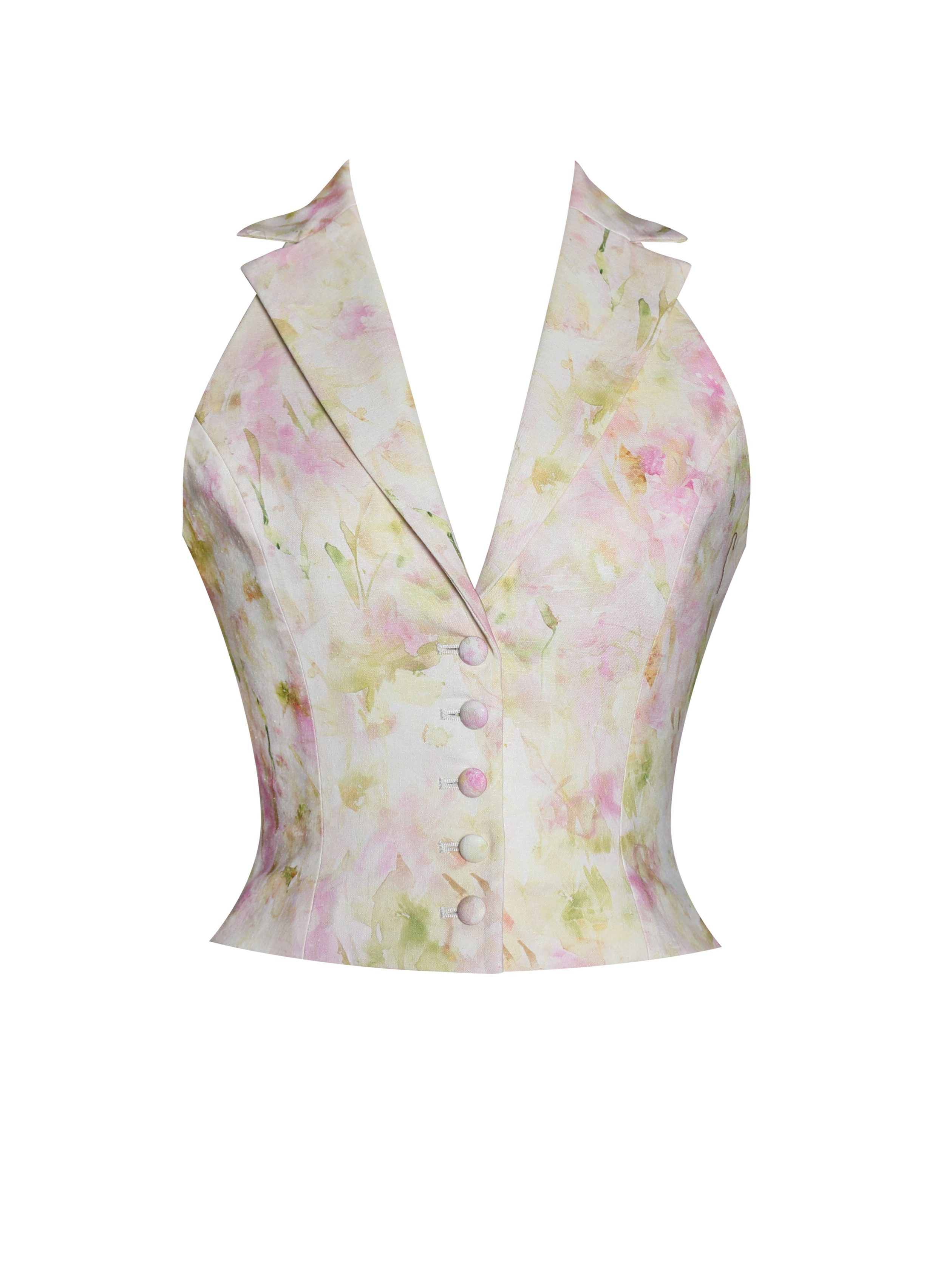 The Lauren Vest is a charming blend of spring freshness and casual elegance. perfect for picnics. vacations. and holidays. Crafted from lightweight linen fabric in a pink floral print. this casual suit vest features a halter neck for a flattering fit. The ruched back adds a touch of texture while providing stretchable comfort. and the button-up front completes the effortlessly chic look. Pair it with the for a perfectly coordinated ensemble.