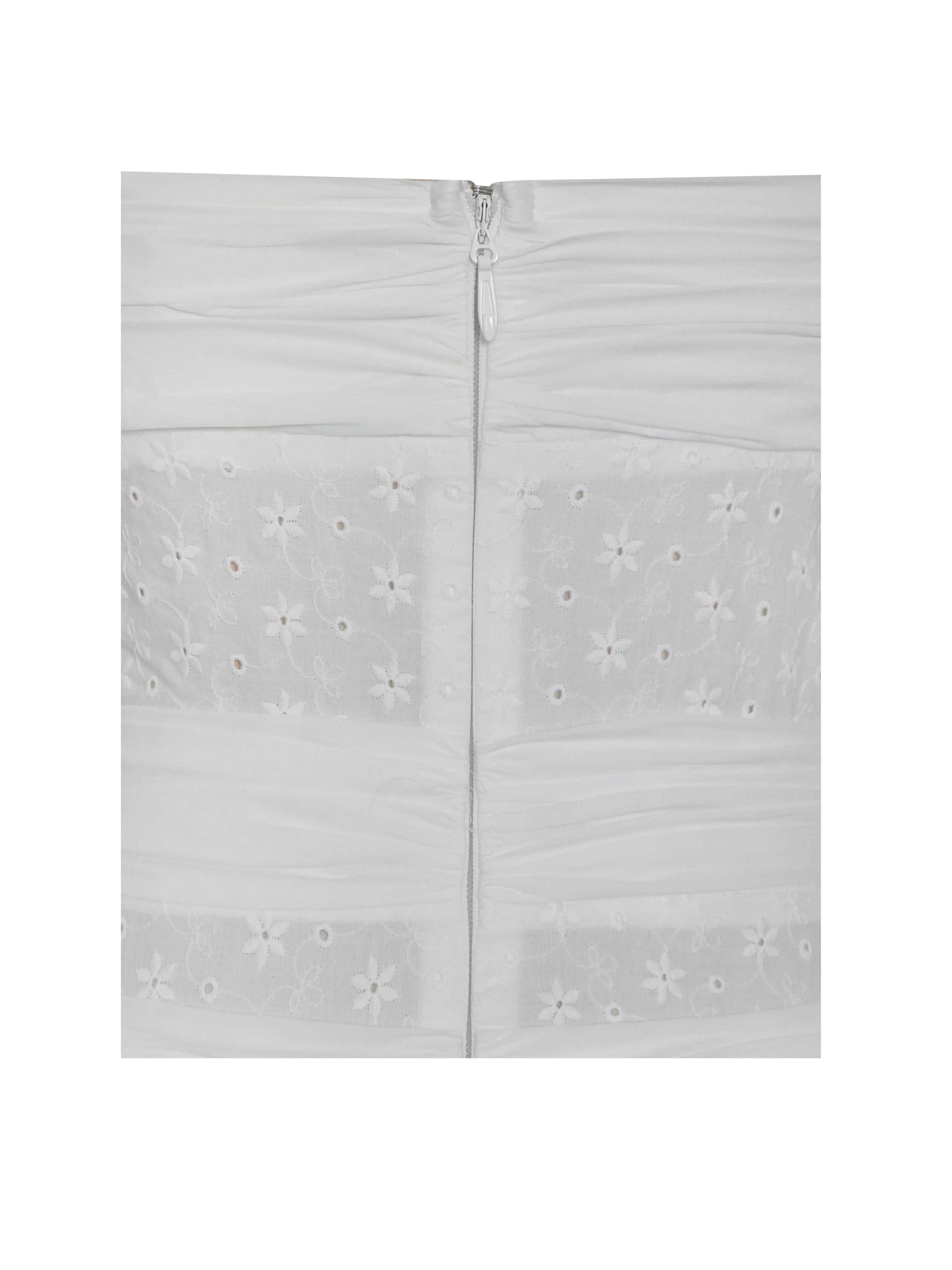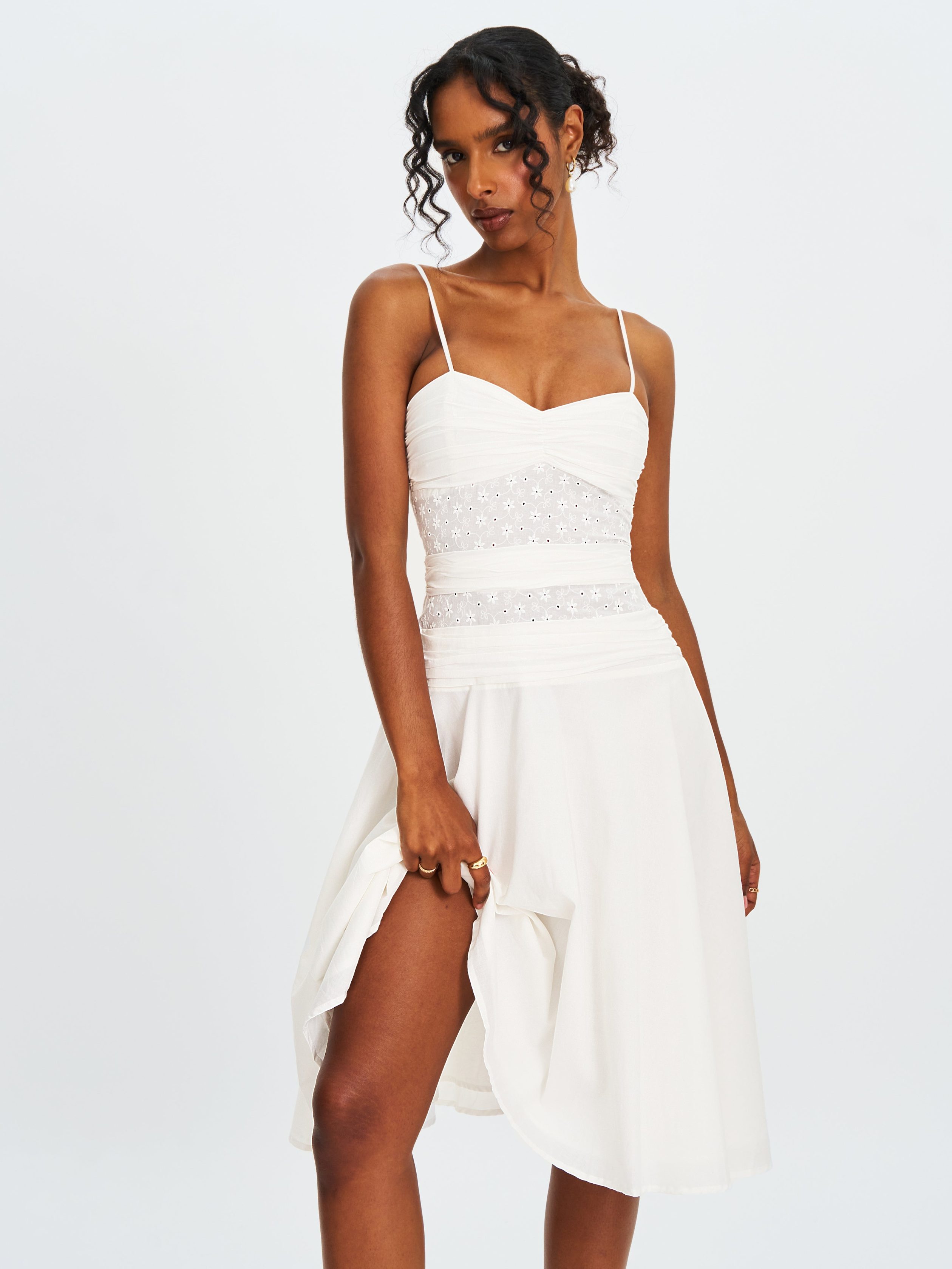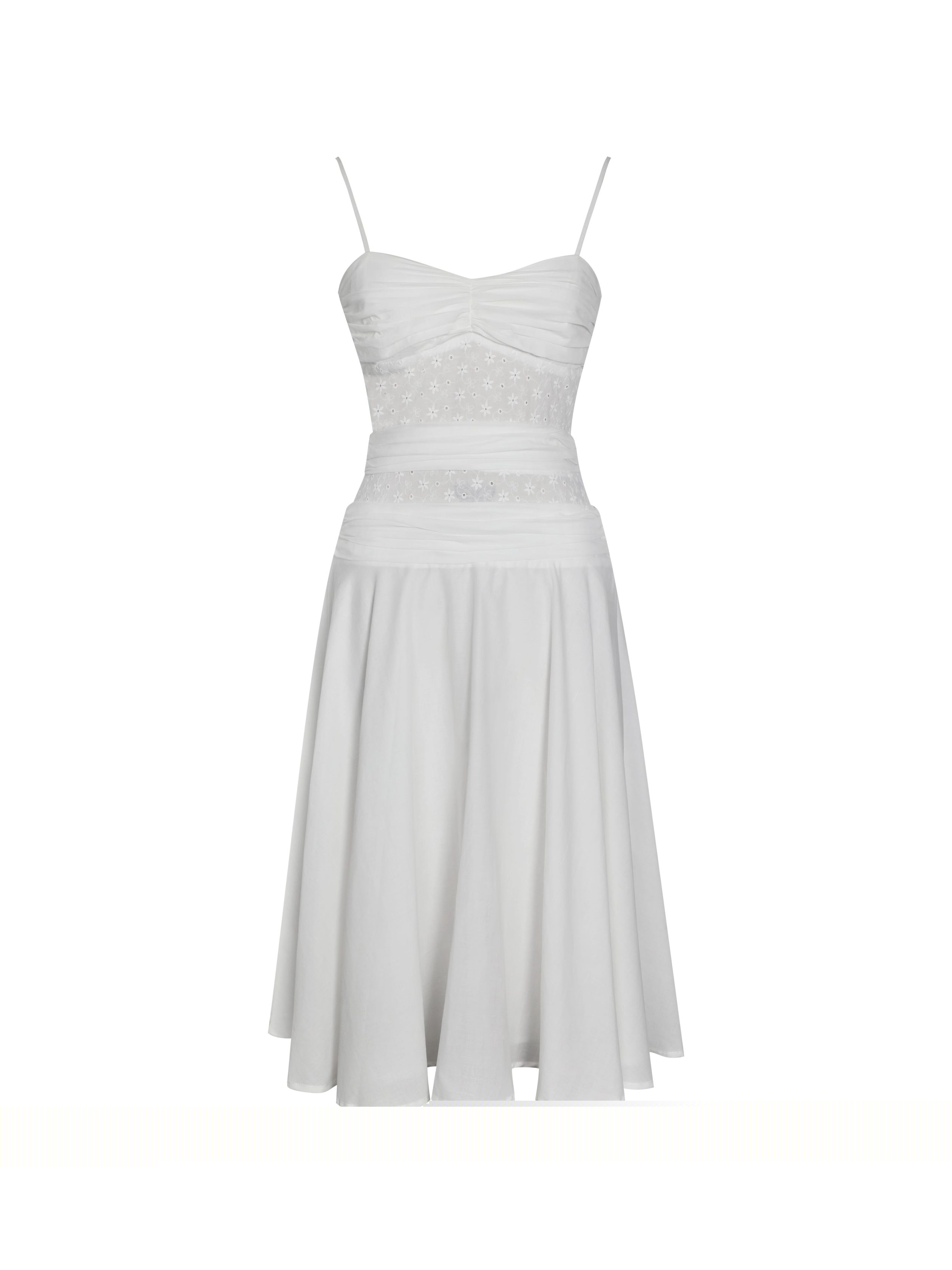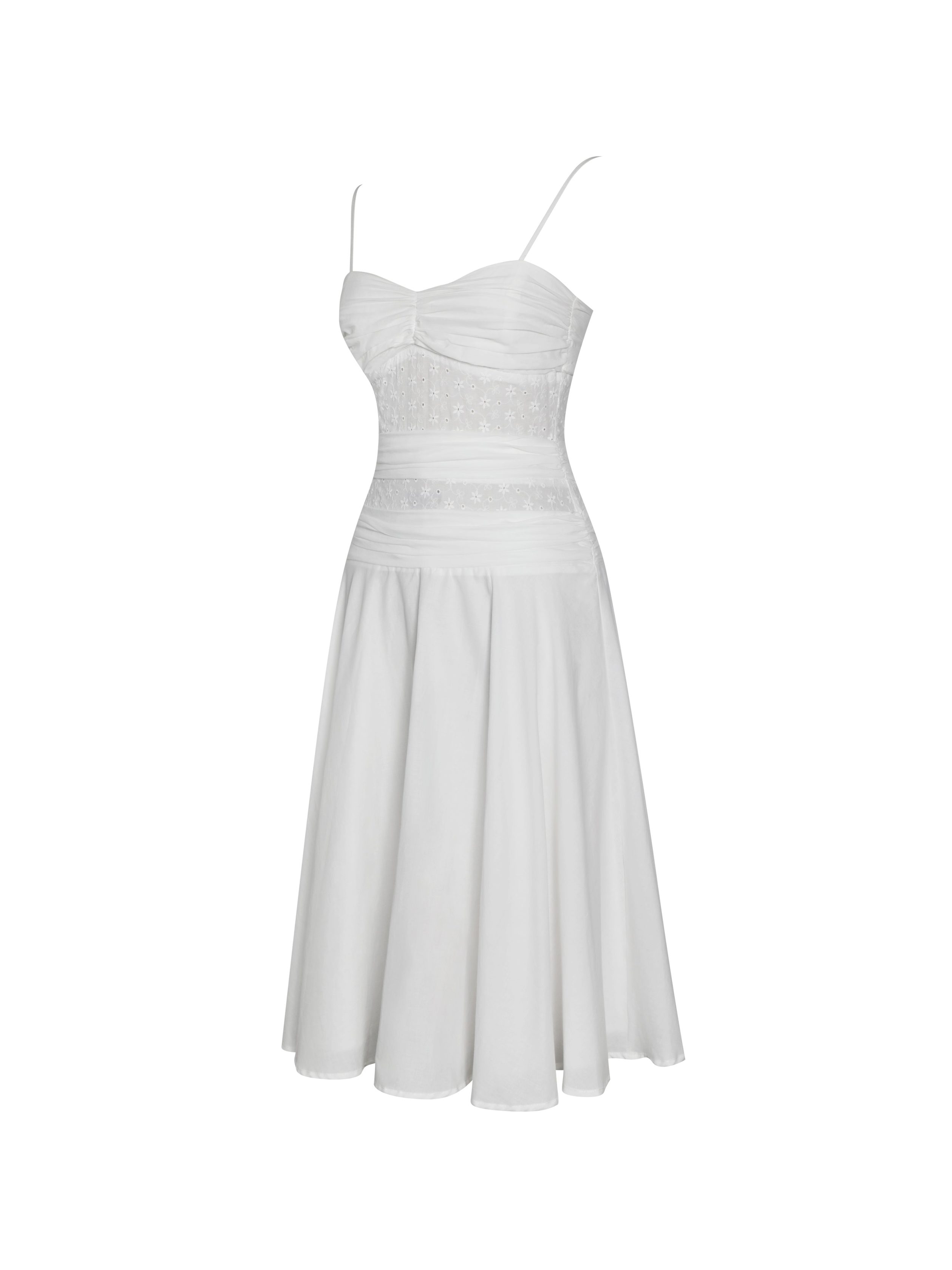 Breezy and effortlessly romantic. the Maelis Dress is crafted from a mix of white eyelet and cotton poplin for a fresh summer feel. Featuring a ruched breast and ruched waist to enhance your figure. it falls into a soft A-line skirt with a flattering drop waist. Designed with adjustable straps. an invisible zipper. and casual charm. this dress is perfect for summer vacations. picnics. or everyday relaxation.