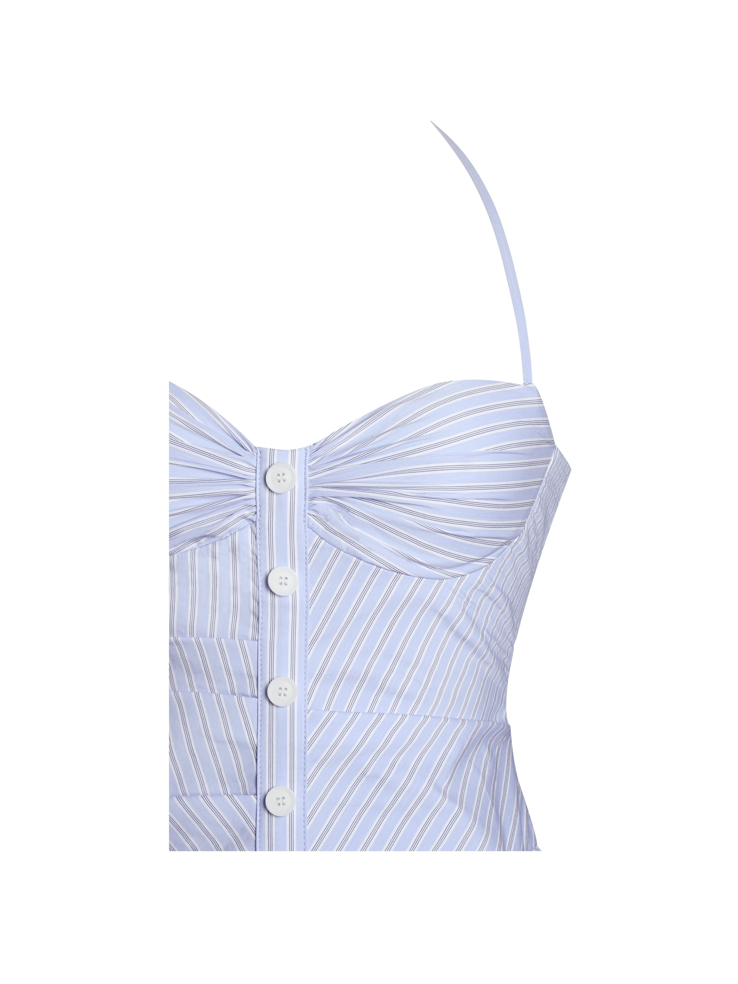 Introducing the Melody mini dress. a sophisticated piece designed in an elegant railroad stripe cotton fabric. This dress features an adjustable halter strap and a pleated design at the breast. adding a touch of delicate detail. The obliquely divided gathers around the waist create a flattering silhouette. complemented by a drop waist A-line skirt with inside support for added structure. Fully lined and cupped for added comfort. the Melody dress is completed with an invisible zipper at the back for a seamless finish. Perfect for day time styling. And it’s also available in and