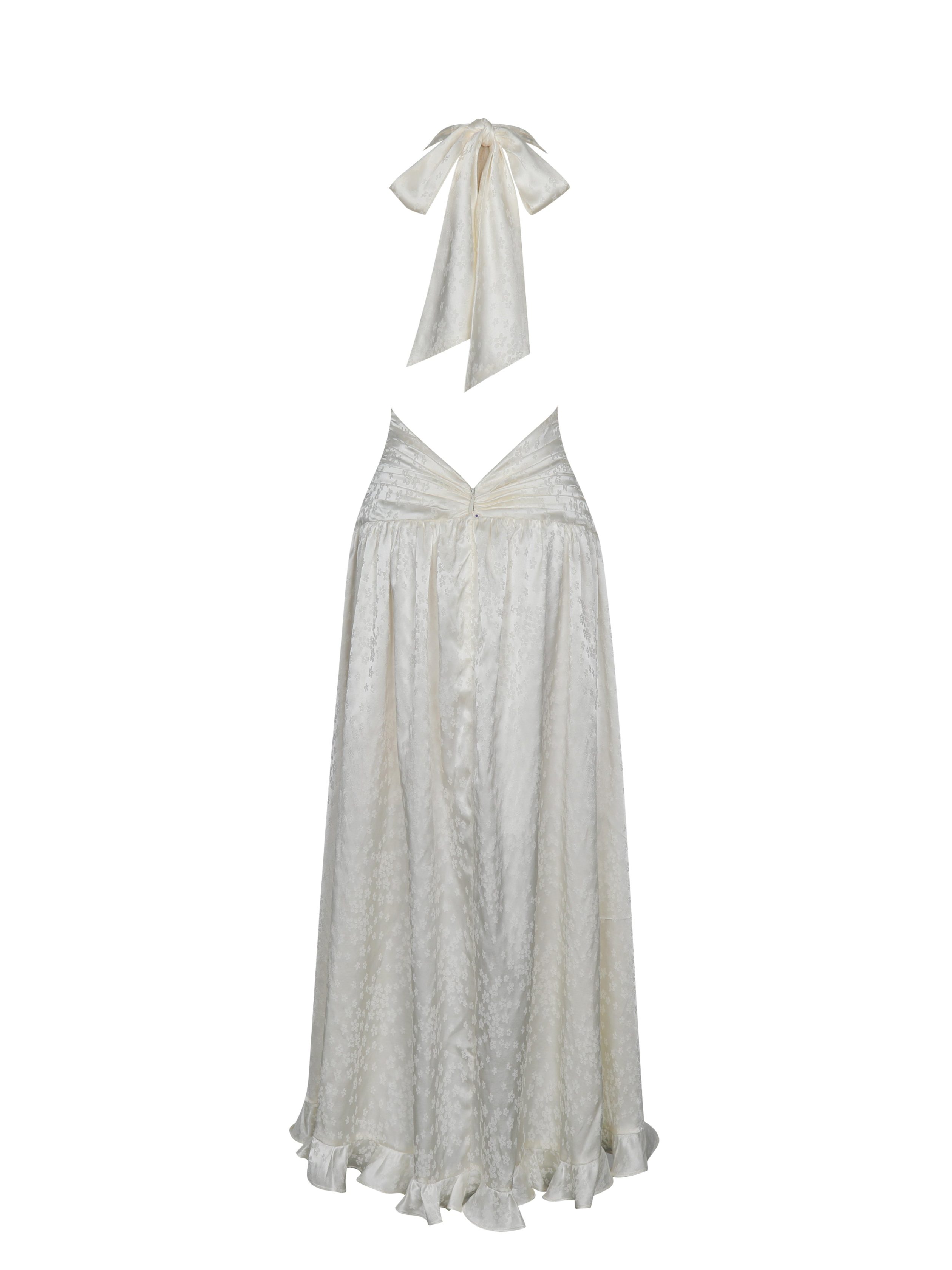 Perfect for brunches. gourmet picnics. and unforgettable vacations—both dreamy and elegant. the Nalani Dress is crafted from buttery cream white satin jacquard adorned with a delicate floral pattern. Featuring a sexy deep V-neckline and ruched waistline. it sculpts a flattering curved silhouette. The backless design adds a bold. breezy allure. while cascading ruffles dance with every step. bringing sweet charm and airy movement. Long halter neck ties flutter gracefully for an extra touch of whimsy. Fully lined with matching satin and finished with an invisible zipper for a truly flawless fit. this dress embodies effortless sophistication and comfort.