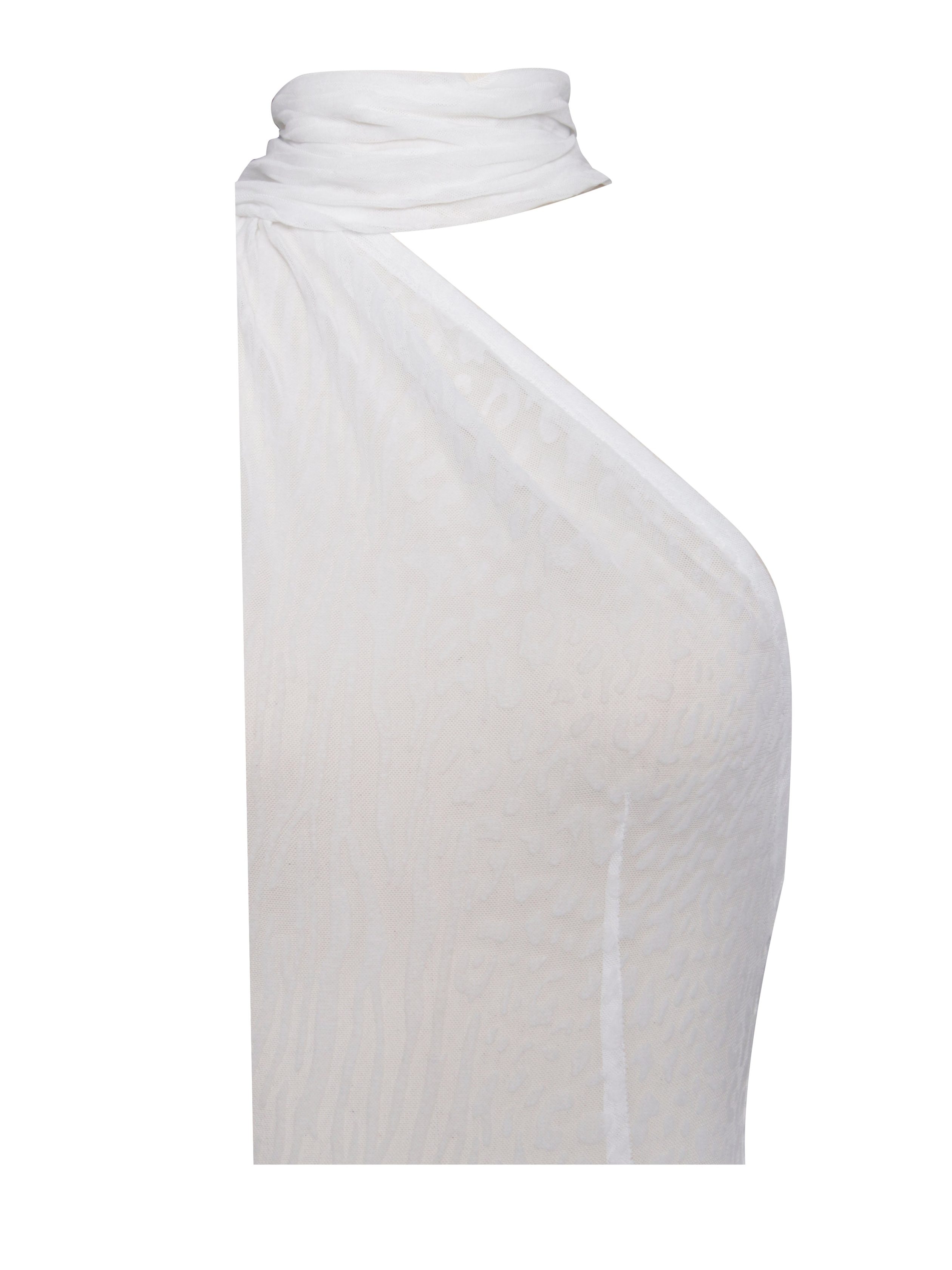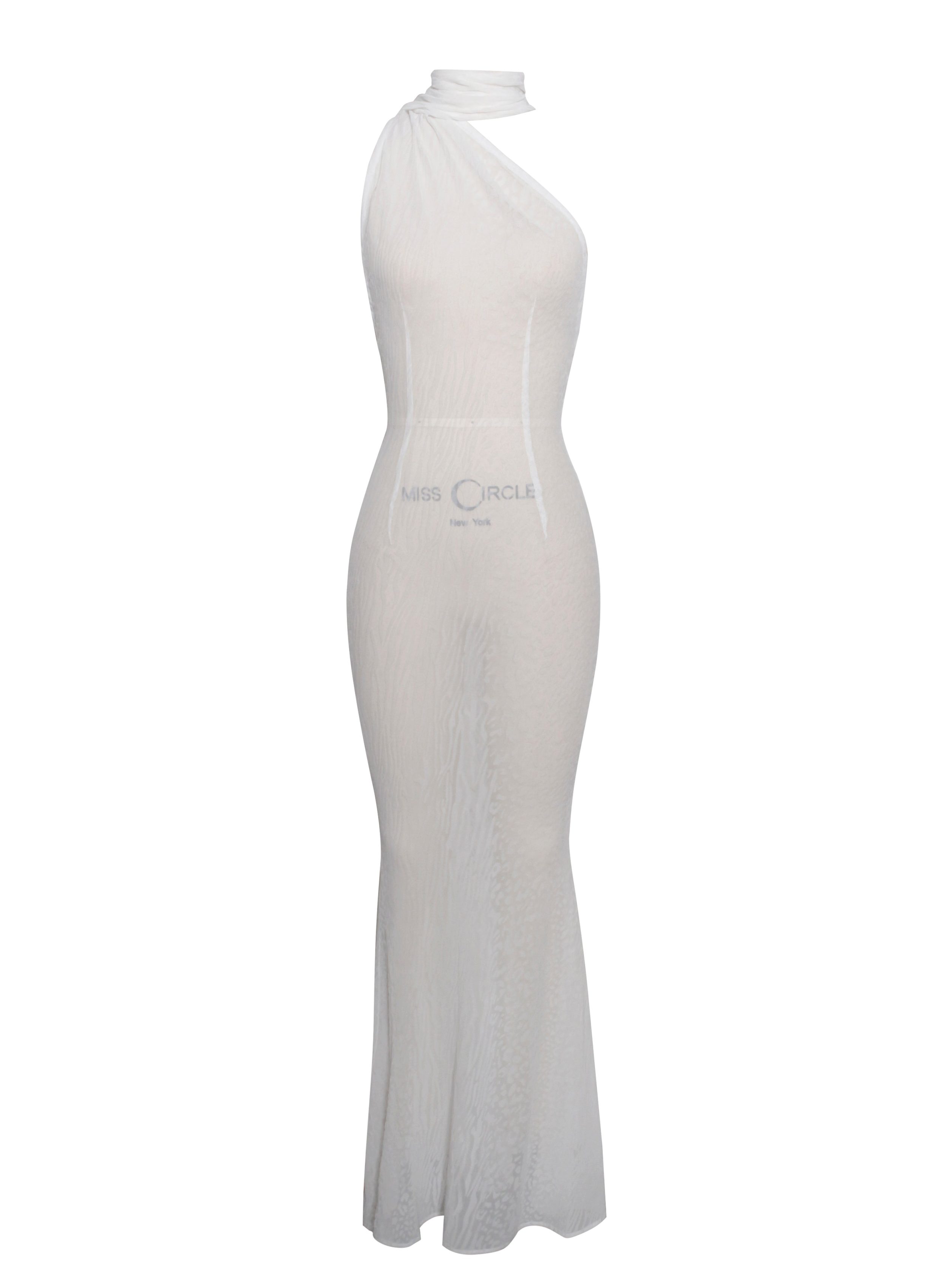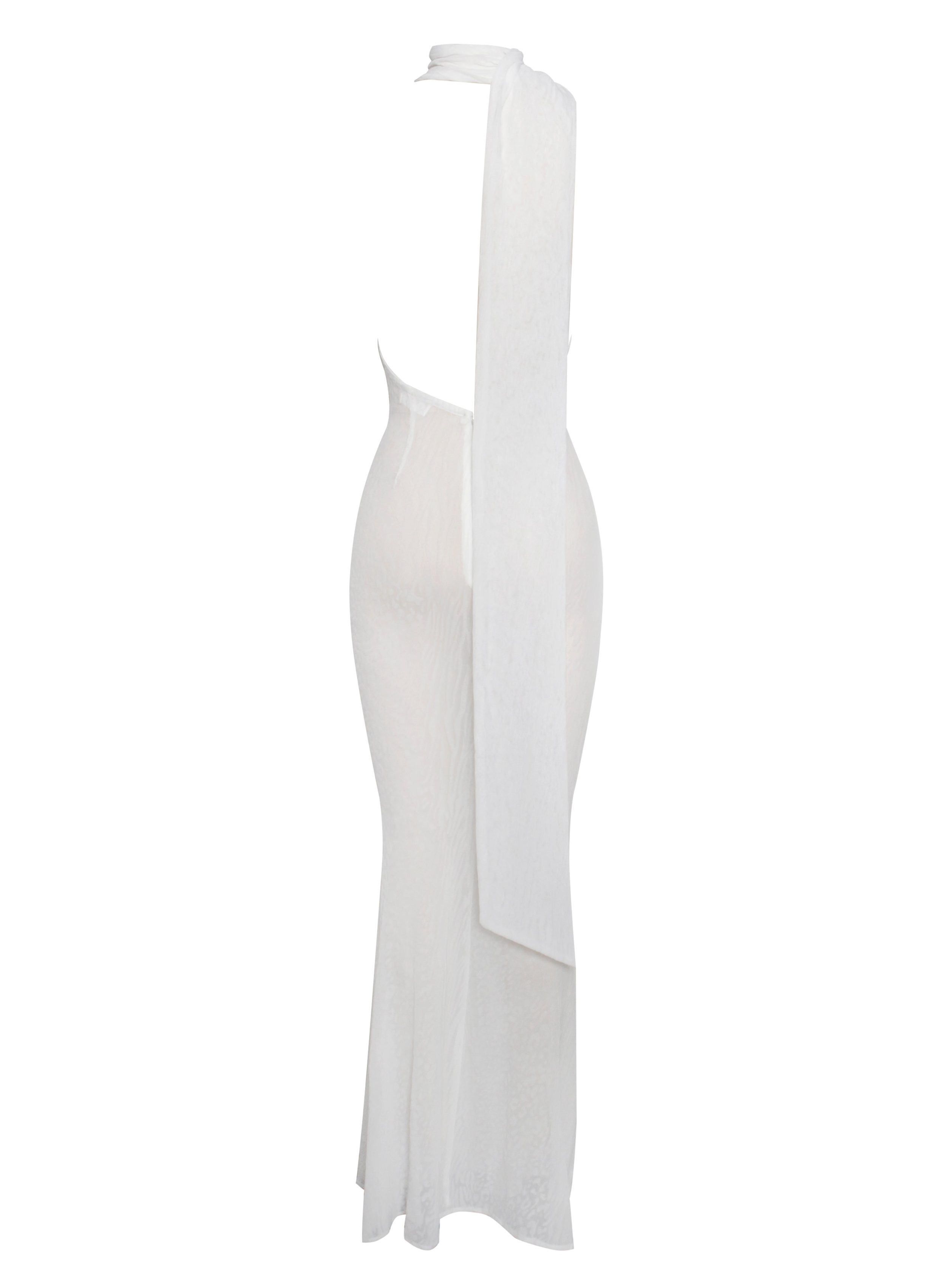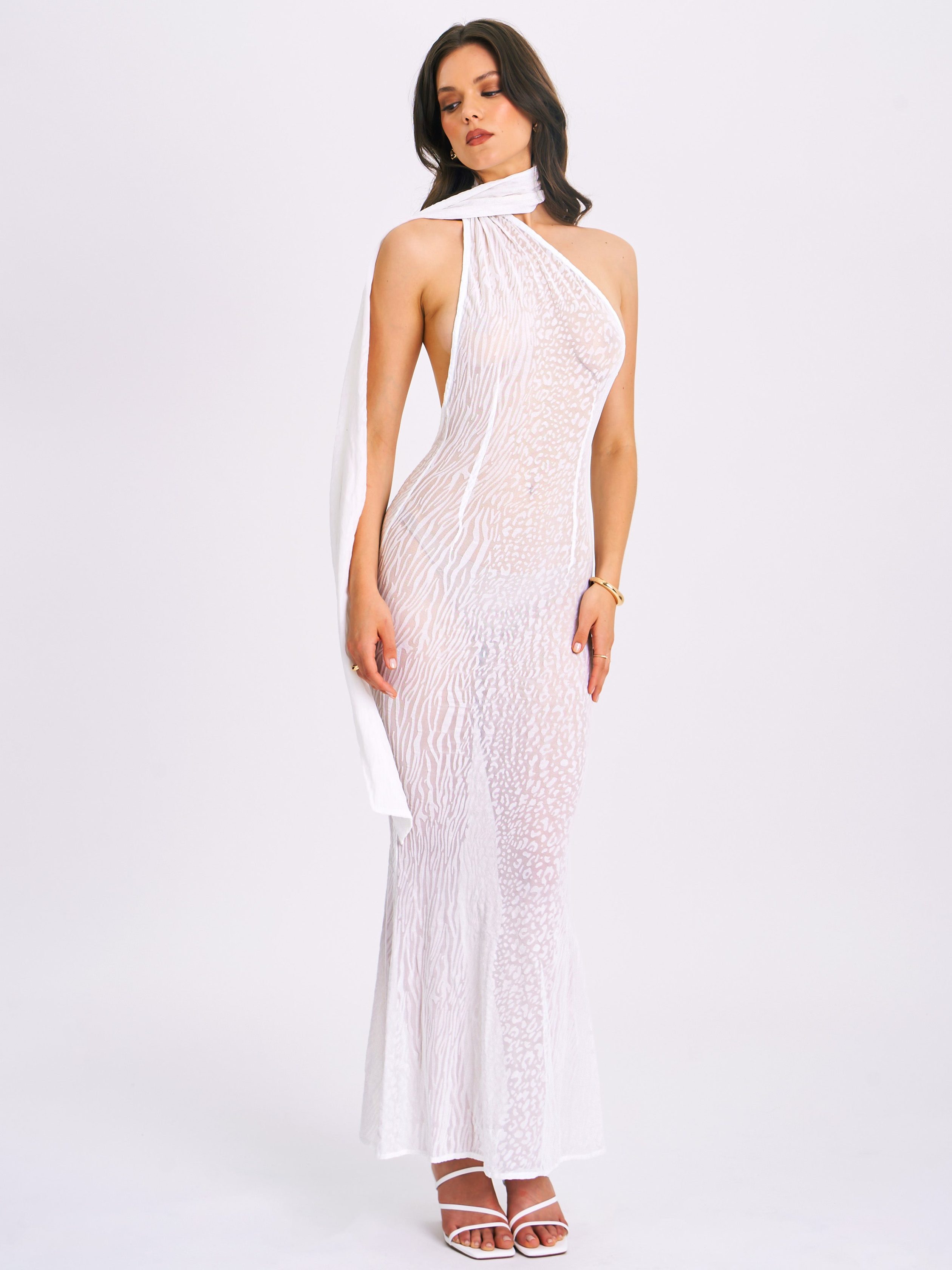Introducing the Olena. a captivating White Burnout Velvet Animal Print Mesh Halter Neck Maxi Dress perfect for summer. This dress features a halter neck design. an alluring open back with button closures. and intricate burnout velvet detailing. The flowing maxi mermaid silhouette enhances your natural curves. while the high-stretch fabric ensures comfort and a sleek look. Ideal for beachside parties. sunset dinners. or any special occasion. the Olena dress will make you the center of attention. Embrace the summer vibes with this stunning piece. This dress is also available in .