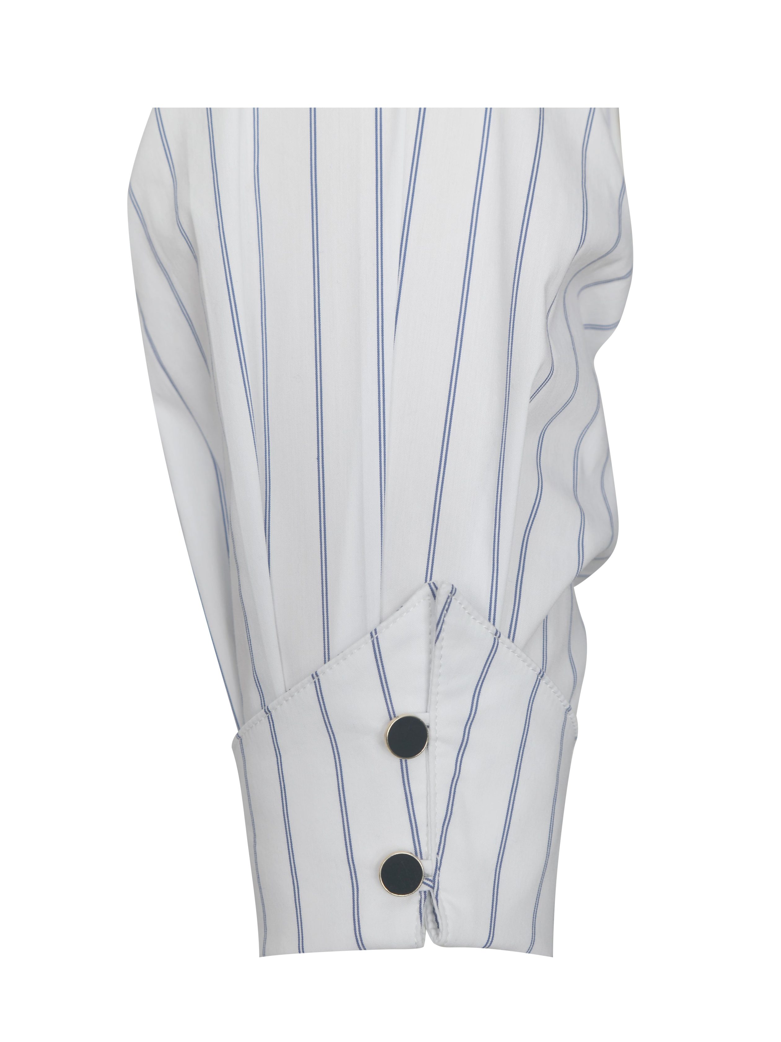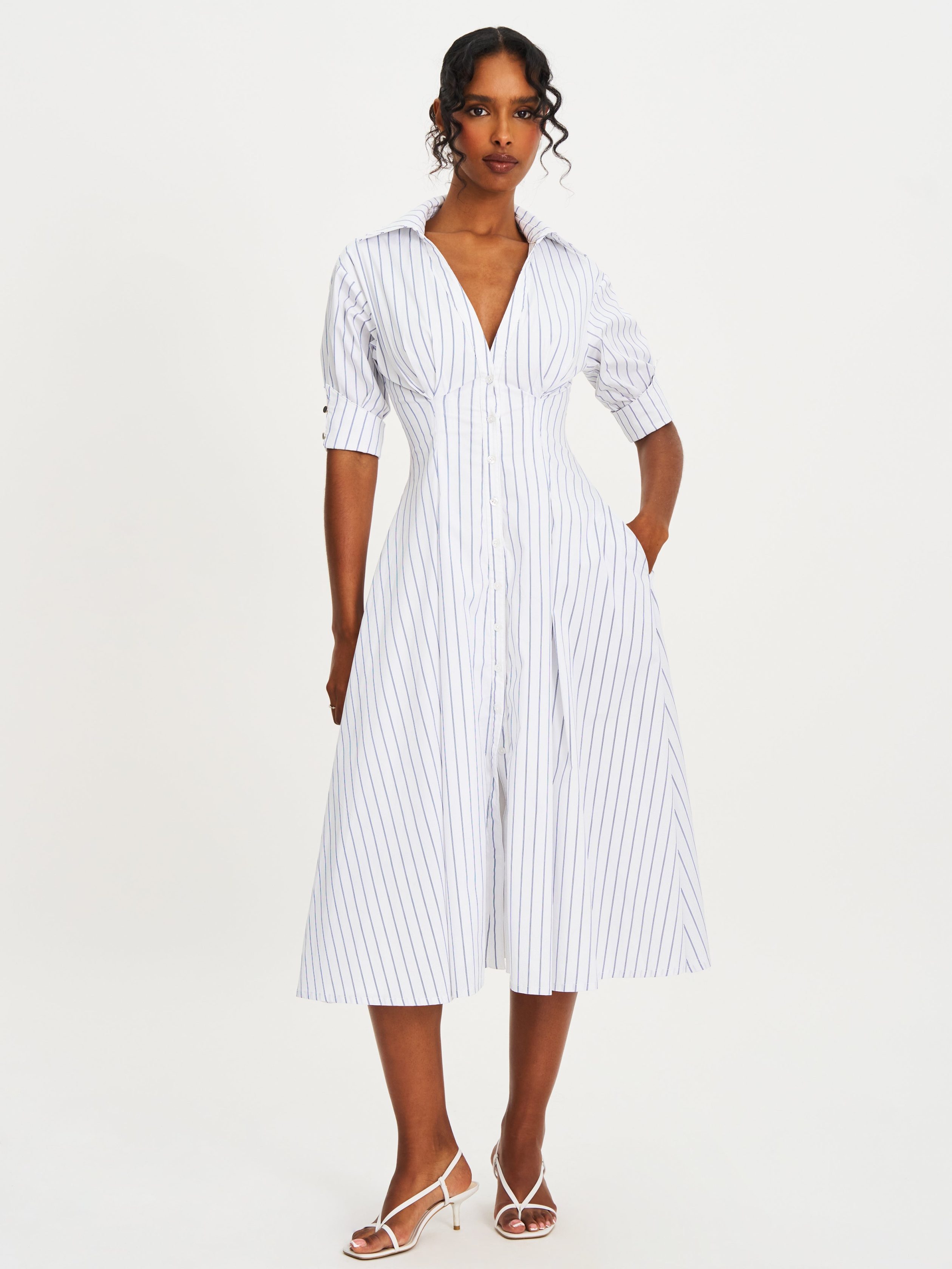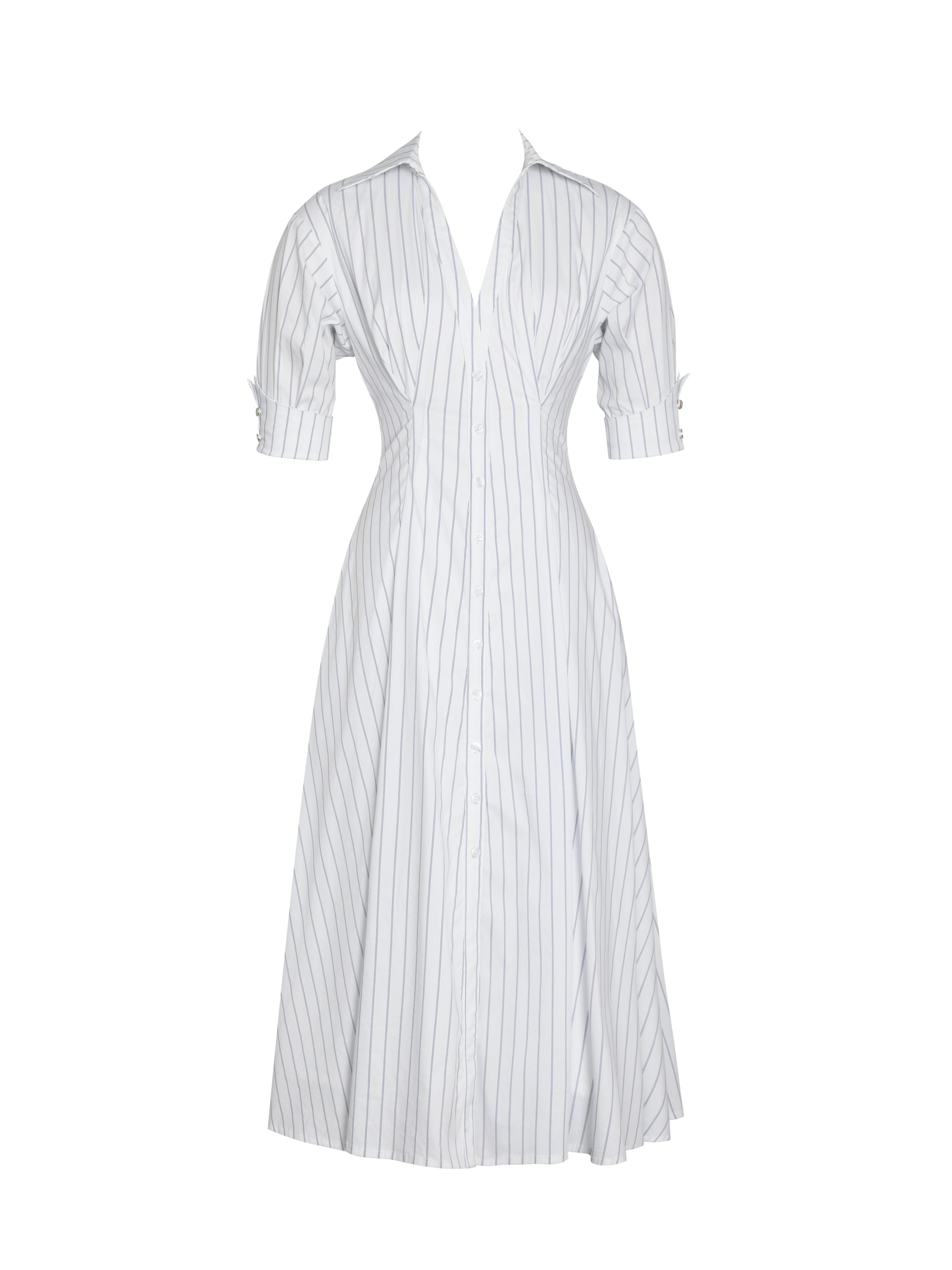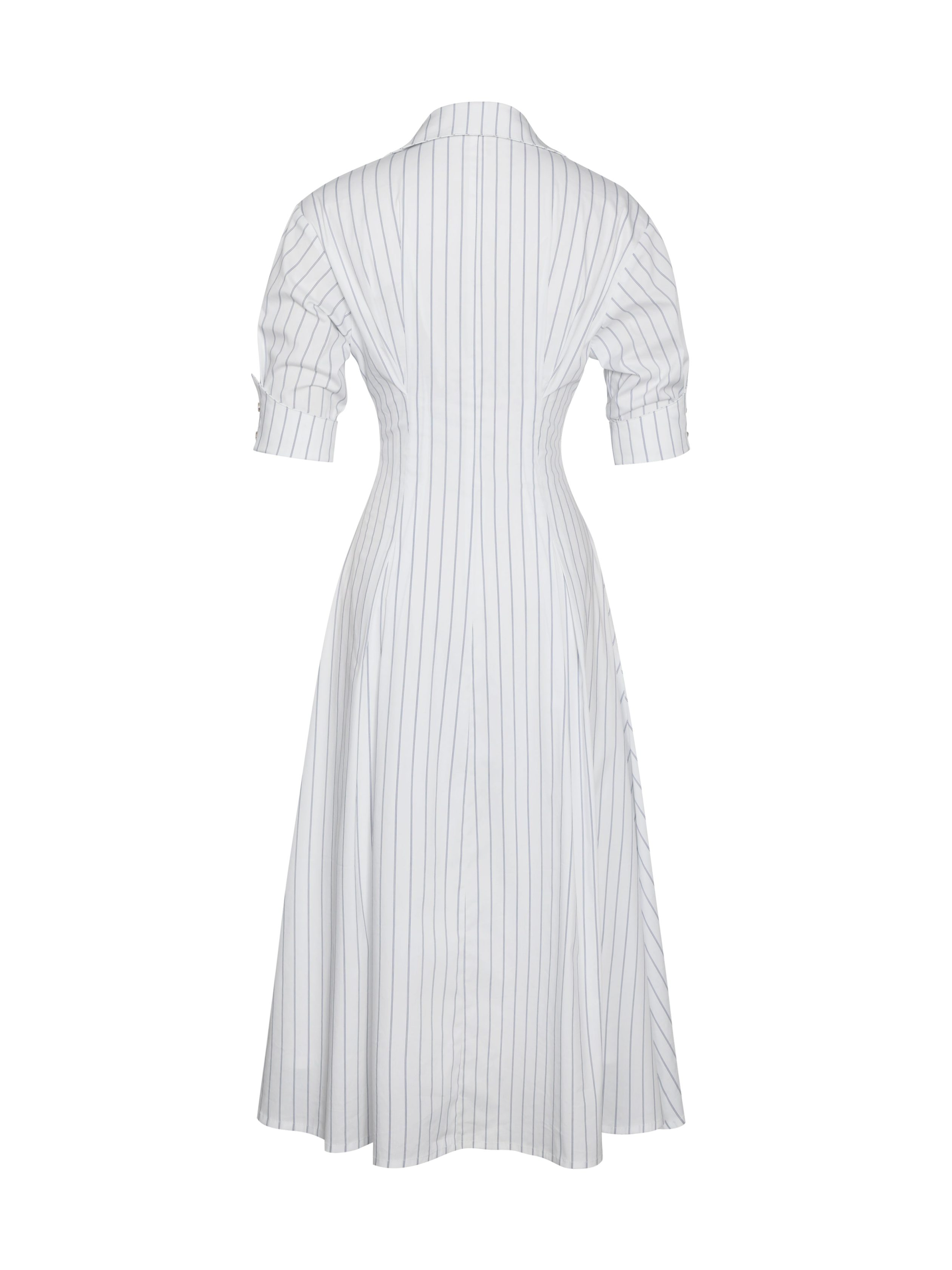 The Palina Dress redefines preppy elegance with its timeless shirt dress silhouette. Made from breathable Cotton Poplin fabric. this midi-length dress features delicate pleated detailing and pinstripes that adds a touch of sophistication. The button-up front and black cuff buttons create a polished business casual look. perfect for both formal and daily wear. Thoughtfully designed with invisible pockets. this versatile white dress is a wardrobe staple for effortless style and comfort.