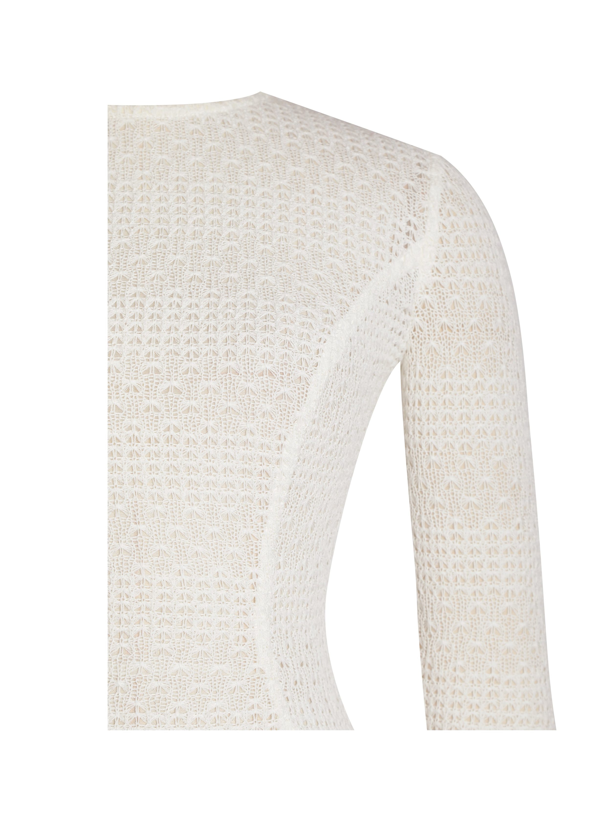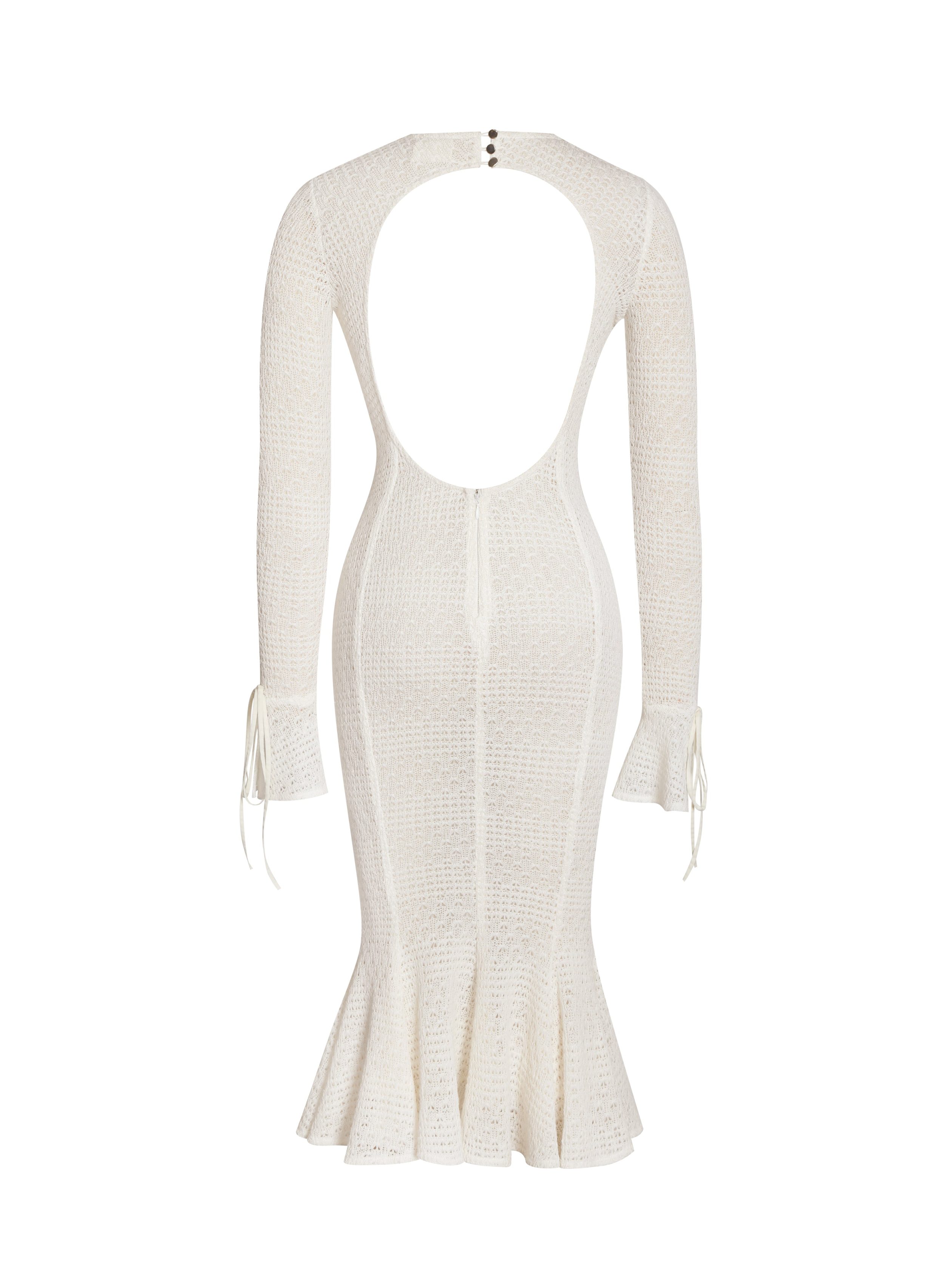 Flirty. sculpted. and sun-ready—the Pamina Dress is your go-to for beachside vacations and sultry summer days that slip into night. Crafted in a crochet-style knit with curve-hugging appeal. it features princess seams and a softly rounded neckline that flows into flared sleeves tied with charming bows. The maxi silhouette flares into a subtle mermaid hem. adding playful movement with every step. A white mesh lining provides airy comfort while keeping the look light and breathable. An open back adds a breezy. head-turning finish. secured by three delicate shank buttons at the neck and a hidden back zipper for a seamless fit. Whether worn solo or as a statement cover-up. the Pamina delivers effortless allure.