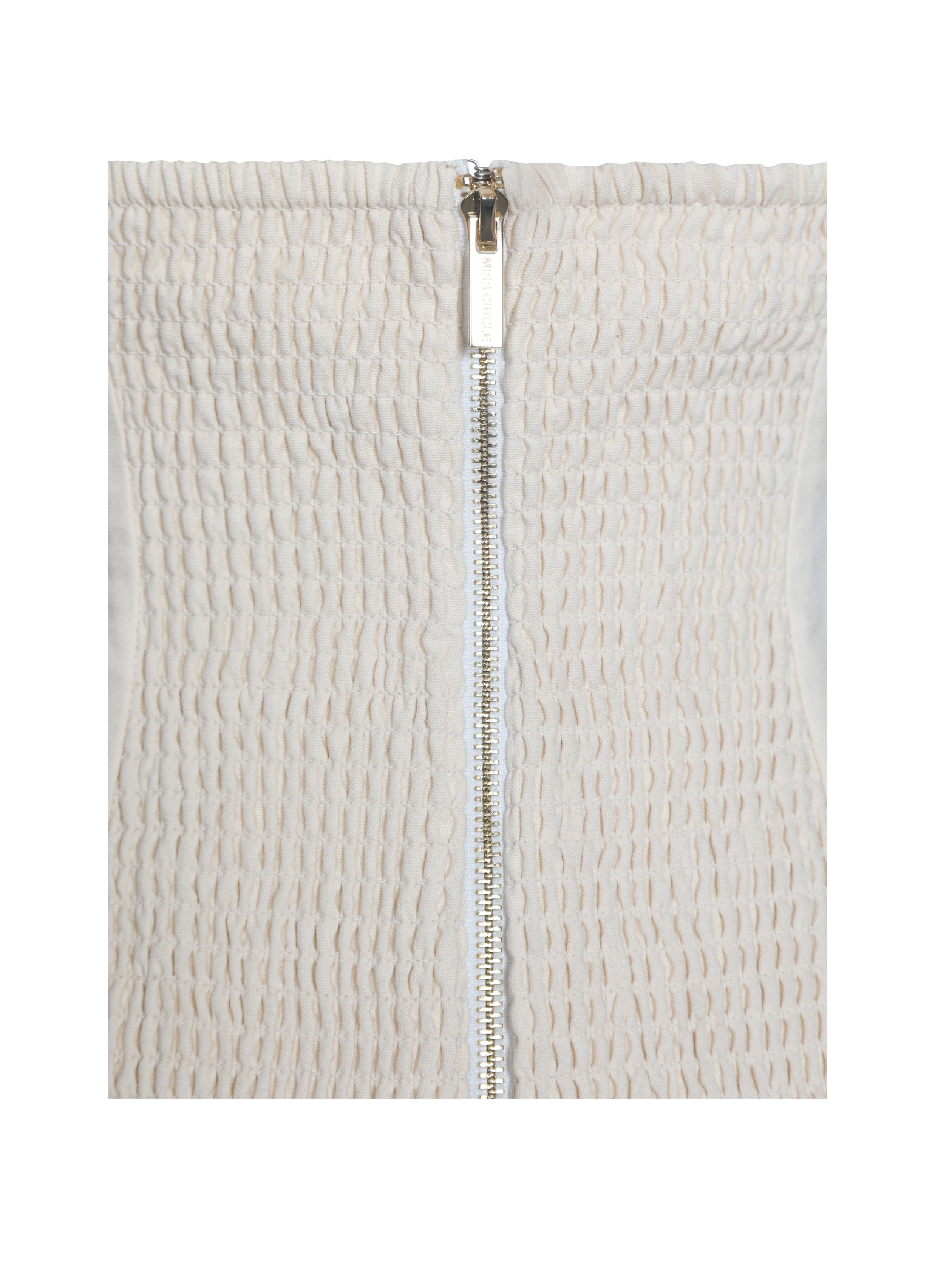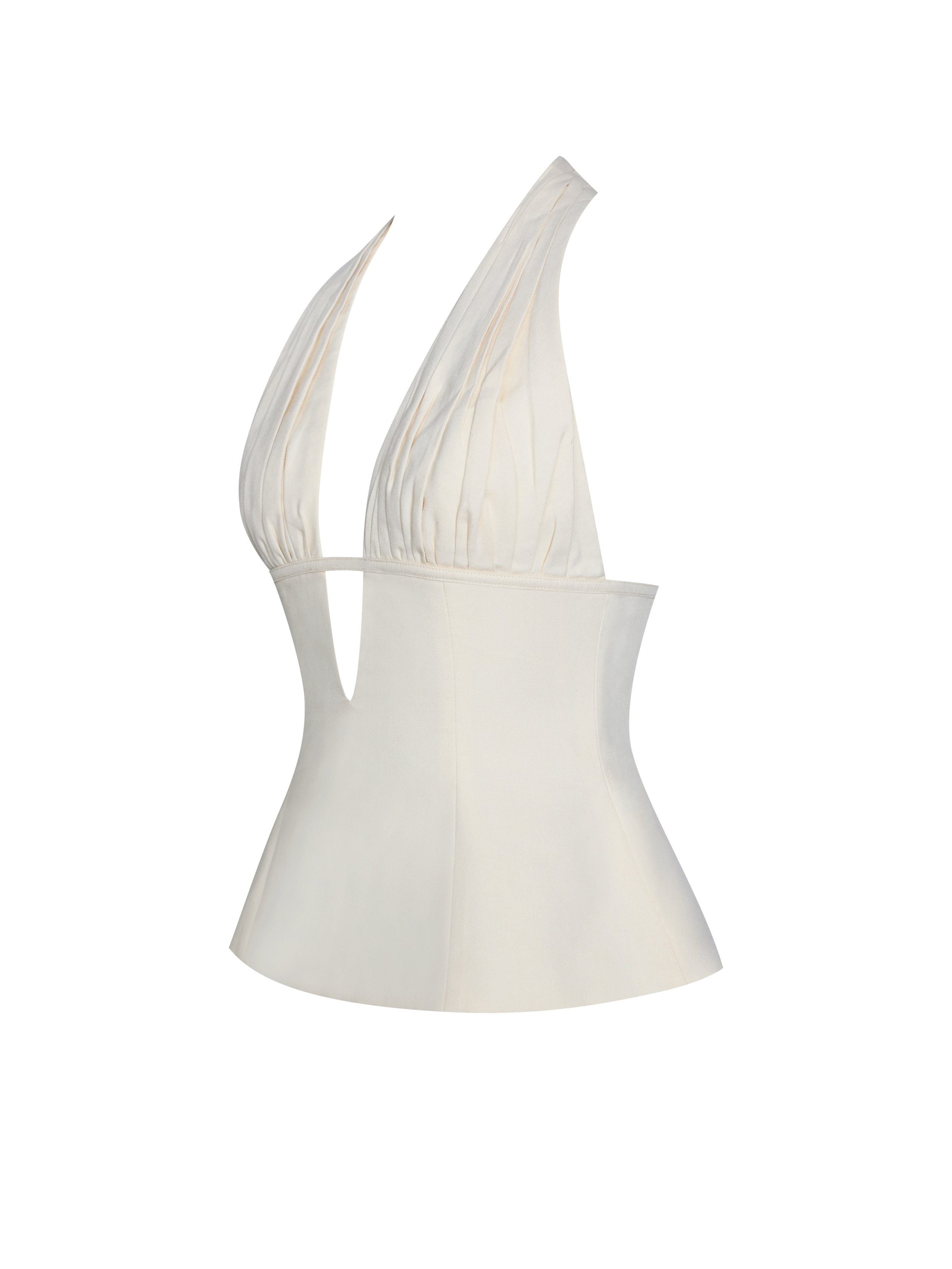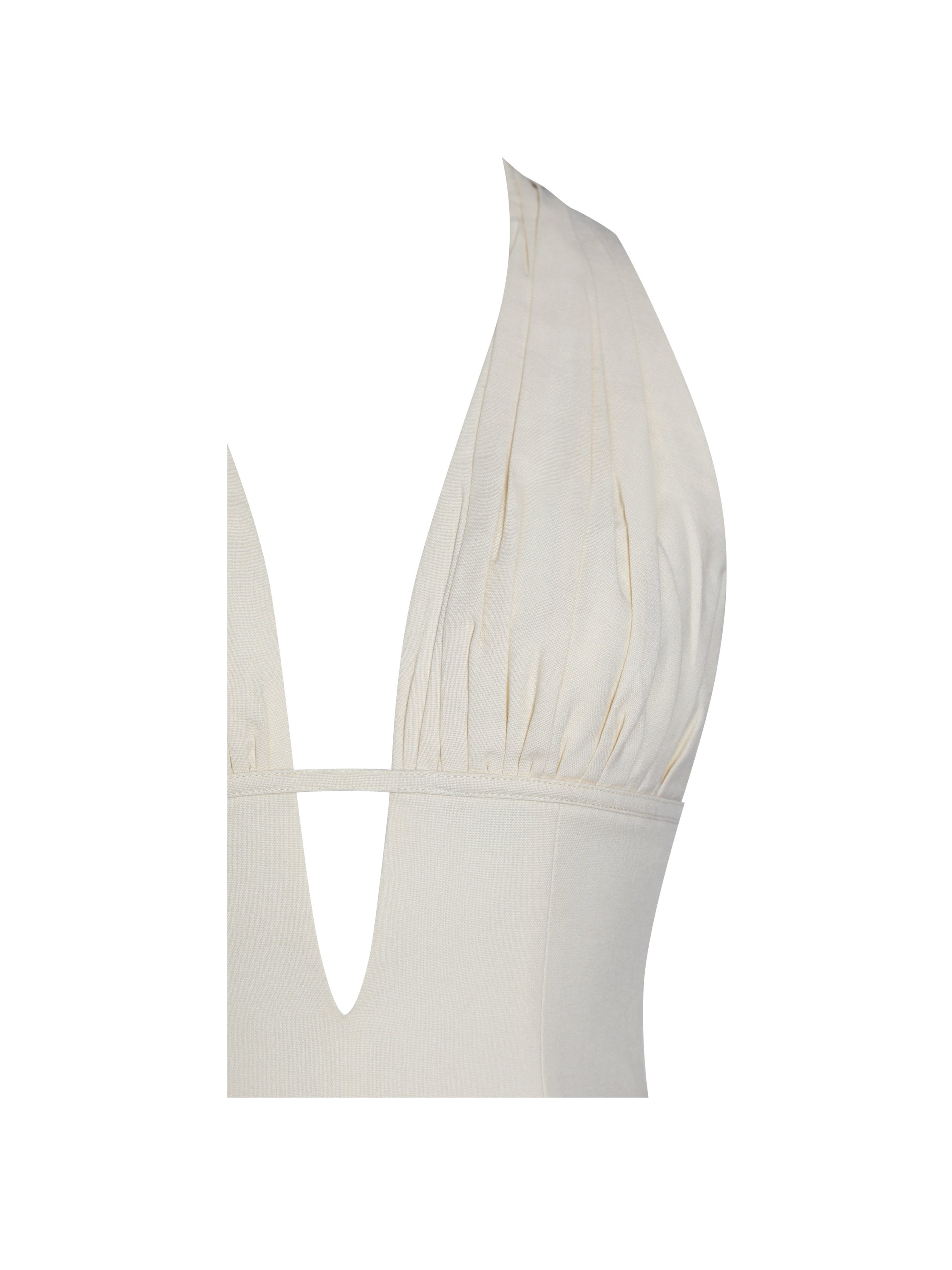 The Quinzella Top features a flattering halter neck and ruched breast with a built-in corset for extra support and shape. Crafted from off-white linen. it’s fully lined for comfort and has a smock back and snatched waist to accentuate your silhouette. Perfectly designed to match the for a chic. coordinated look.