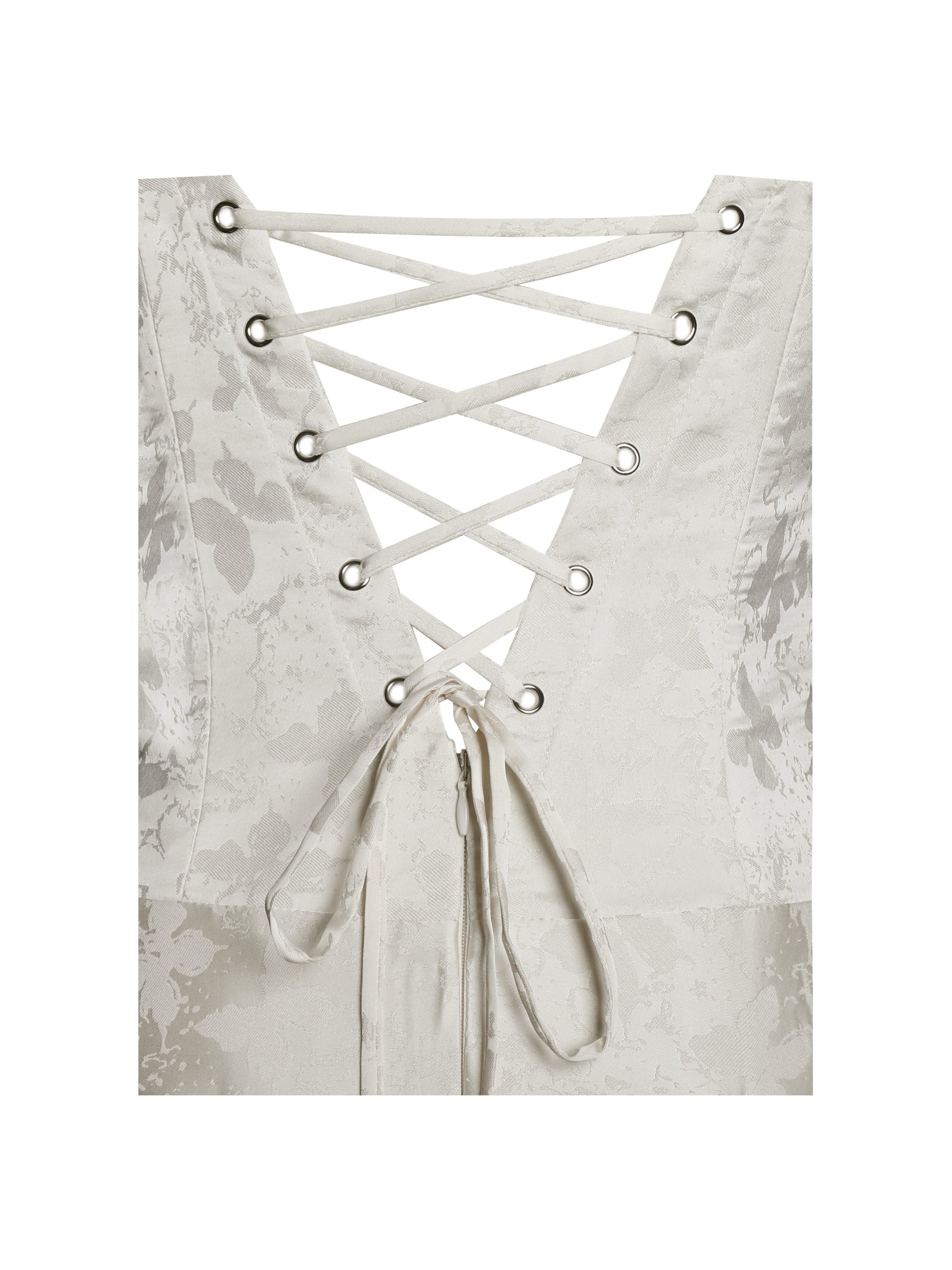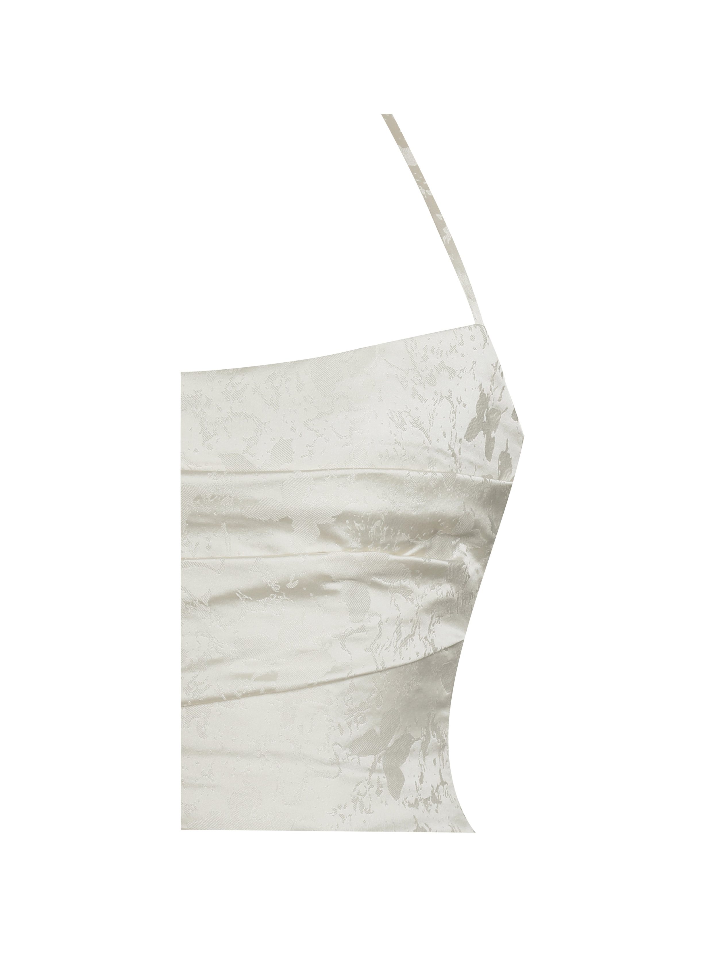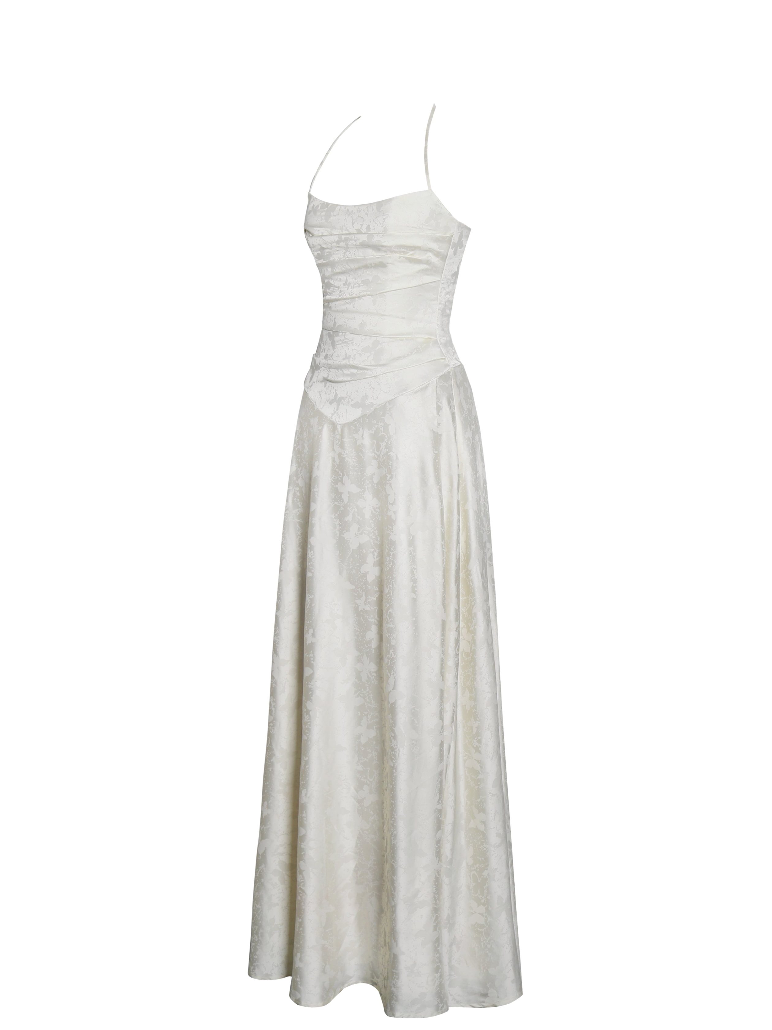 Ethereal and effortlessly elegant. the Raegan Dress is a timeless masterpiece perfect for weddings. engagements. formal events. summer celebrations. and birthday parties. Designed in a dreamy pearl withe jacquard fabric. it features a ruched top that beautifully enhances your silhouette. The halter laces and lace-up back add a touch of romantic allure. while the drop waist creates a flattering. elongated shape. A high slit adds movement and drama. making it ideal for dancing the night away. With built-in bones for structure. an invisible zipper for a seamless finish. and full lining for comfort. the Raegan Dress is a stunning statement for any unforgettable occasion. And it’s also available in .