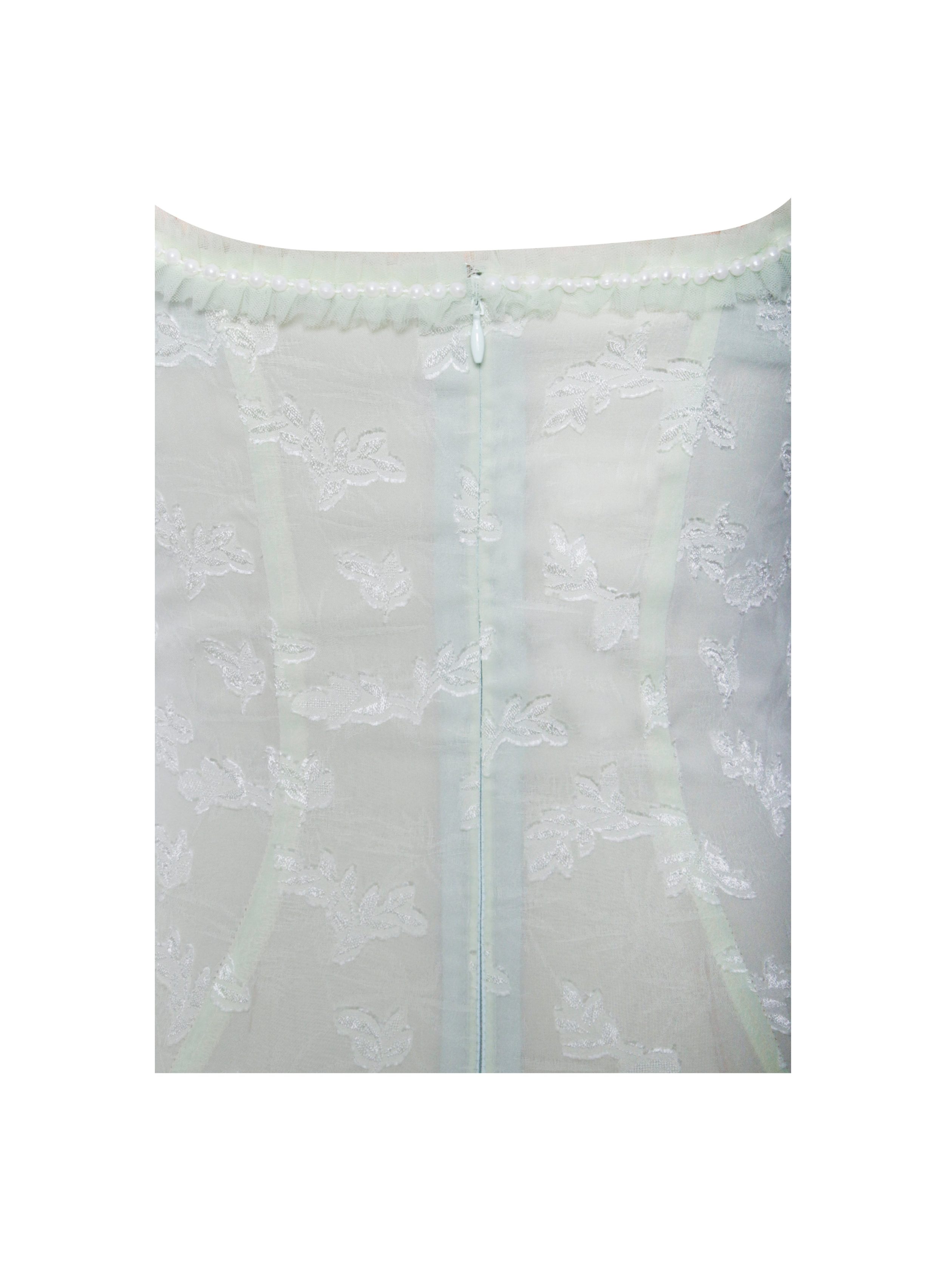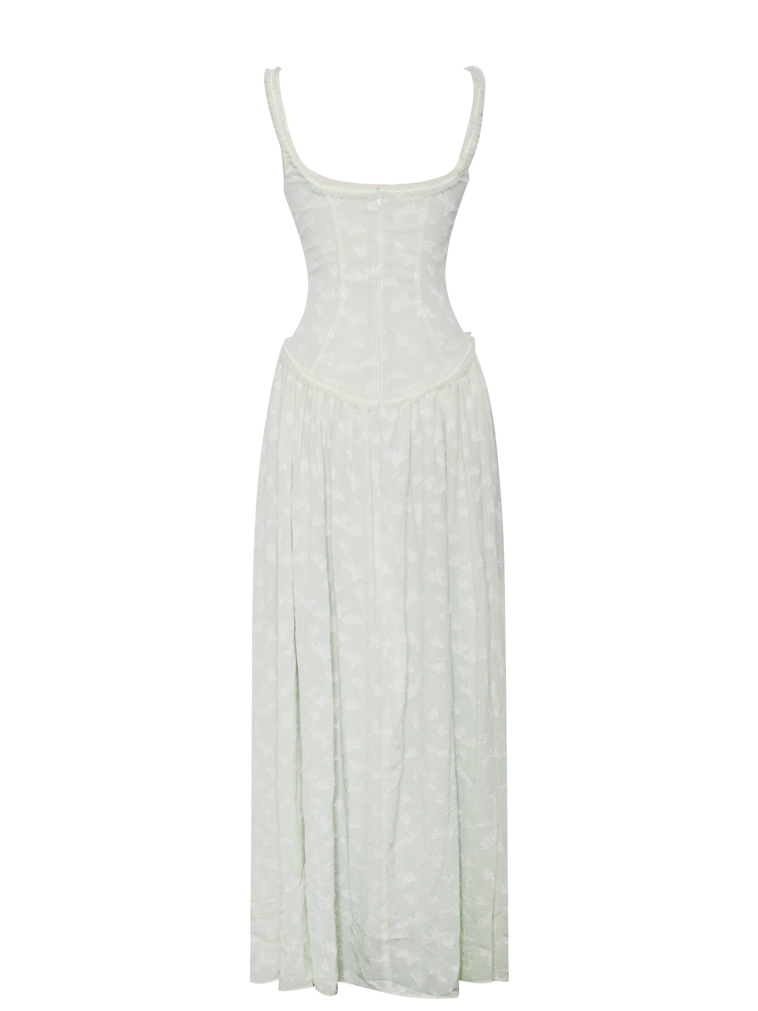 Meet the Ulissa dress. a fusion of elegance and modern sophistication. Fully lined for ultimate comfort. this jacquard textured maxi dress boasts a striking square neckline embellished with pearl decorations. The drop waist seamlessly transitions into a high-slit skirt. lending a dramatic flair to the silhouette. Delicate pleated mesh trim adds a touch of femininity. while an invisible zipper at the center back ensures a flawless finish. Suitable for any formal occasion. this dress effortlessly blends timeless charm with contemporary style. making it a standout piece in any wardrobe.
