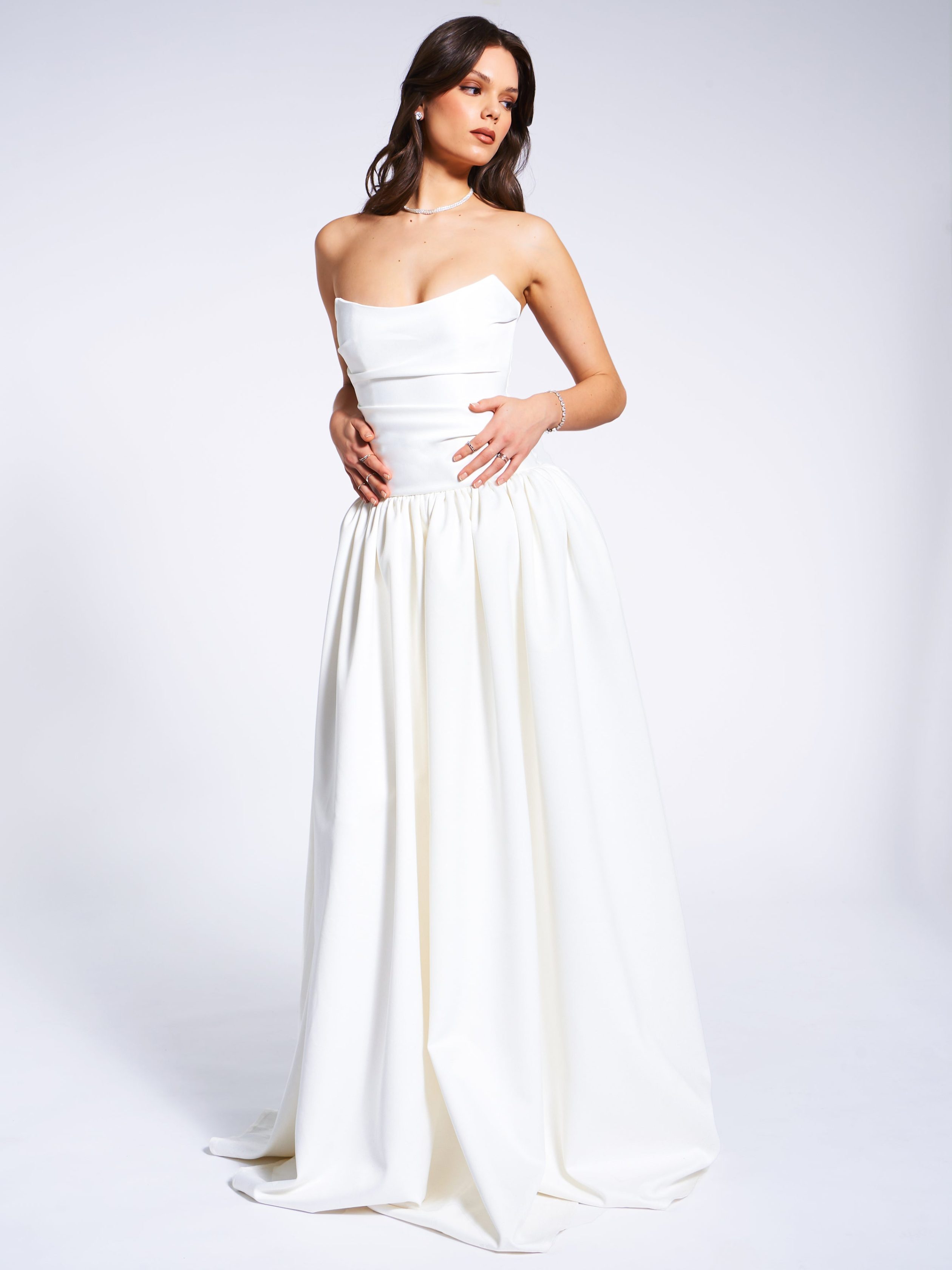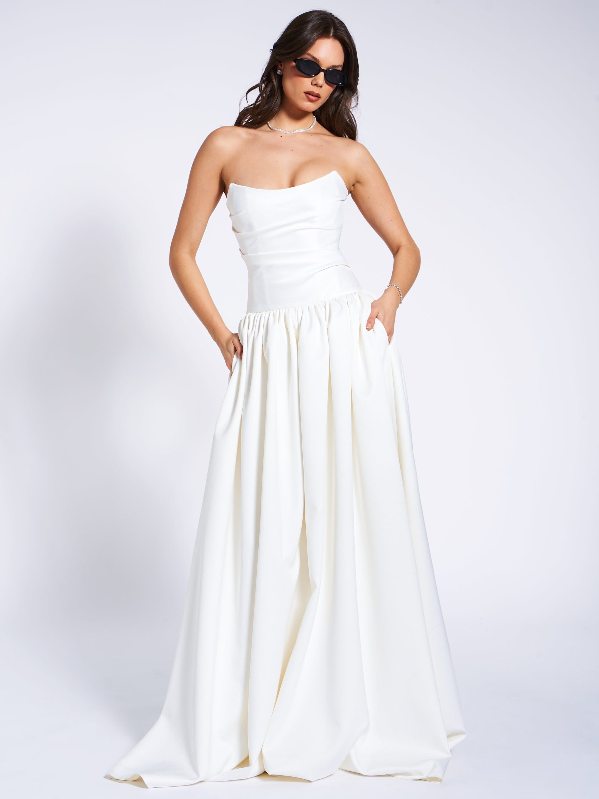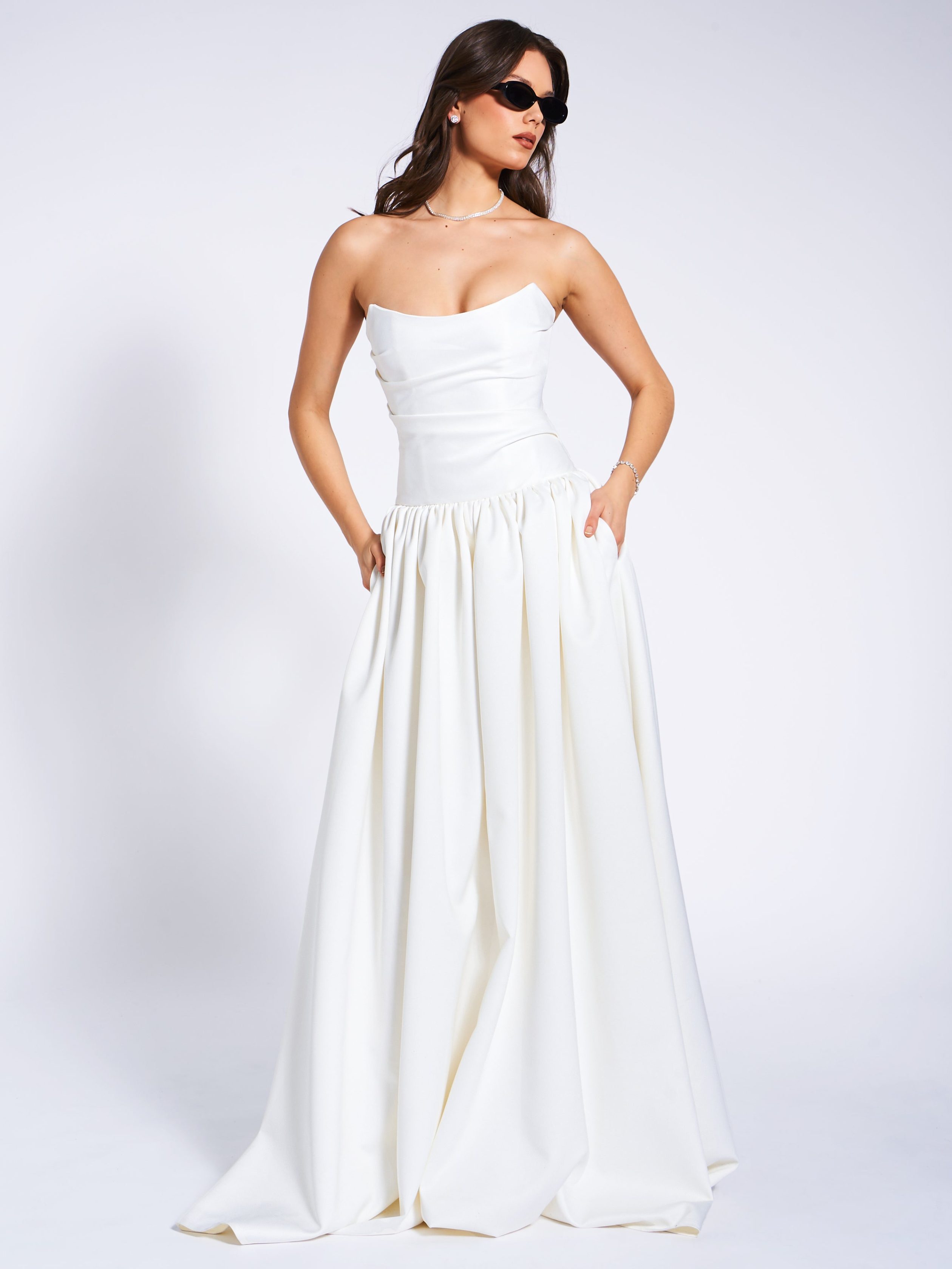 Experience the epitome of timeless elegance with our latest drop waist dress. a stunning creation designed for the most memorable moments in life. Crafted from luxurious white satin. this dress radiates sophistication and is the perfect choice for weddings or other special occasions. The full-length skirt cascades with graceful volume. creating a silhouette that is both romantic and captivating. while discreet side pockets offer a practical touch without compromising the dress’s refined aesthetic.