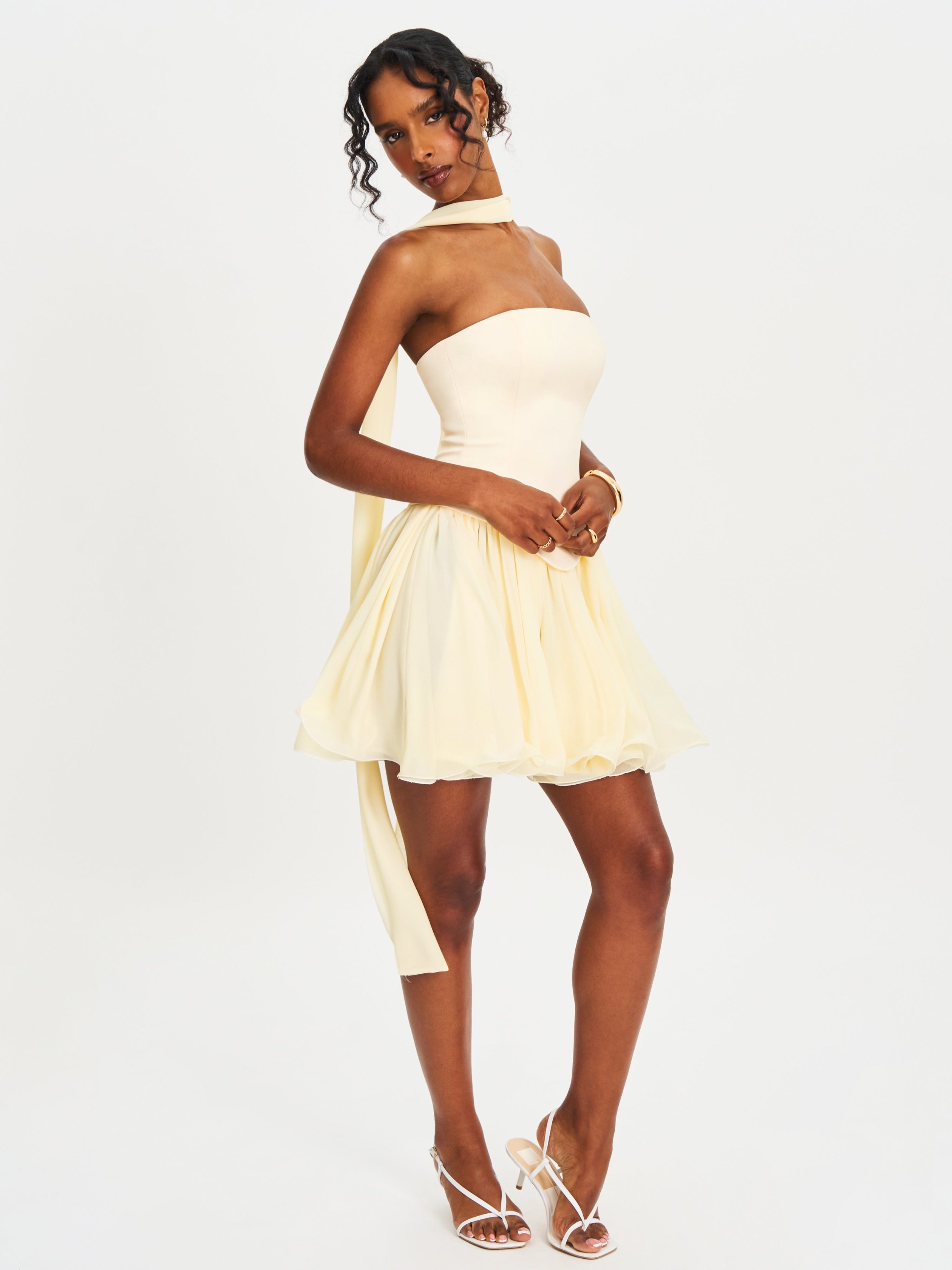Charming and romantic. the Valentina Dress is a baby blue mini that blends playful elegance with elevated details. Featuring a strapless satin top with a structured boned curve edge and built-in corset. it’s designed to flatter and support. A delicate peplum waist flows into a layered chiffon skirt. bringing softness and graceful movement to the silhouette. Finished with a lace-up back for an adjustable fit. this dress comes fully lined and includes a matching chiffon scarf for added versatility. Perfect for special events or summer soirées. and also available in .