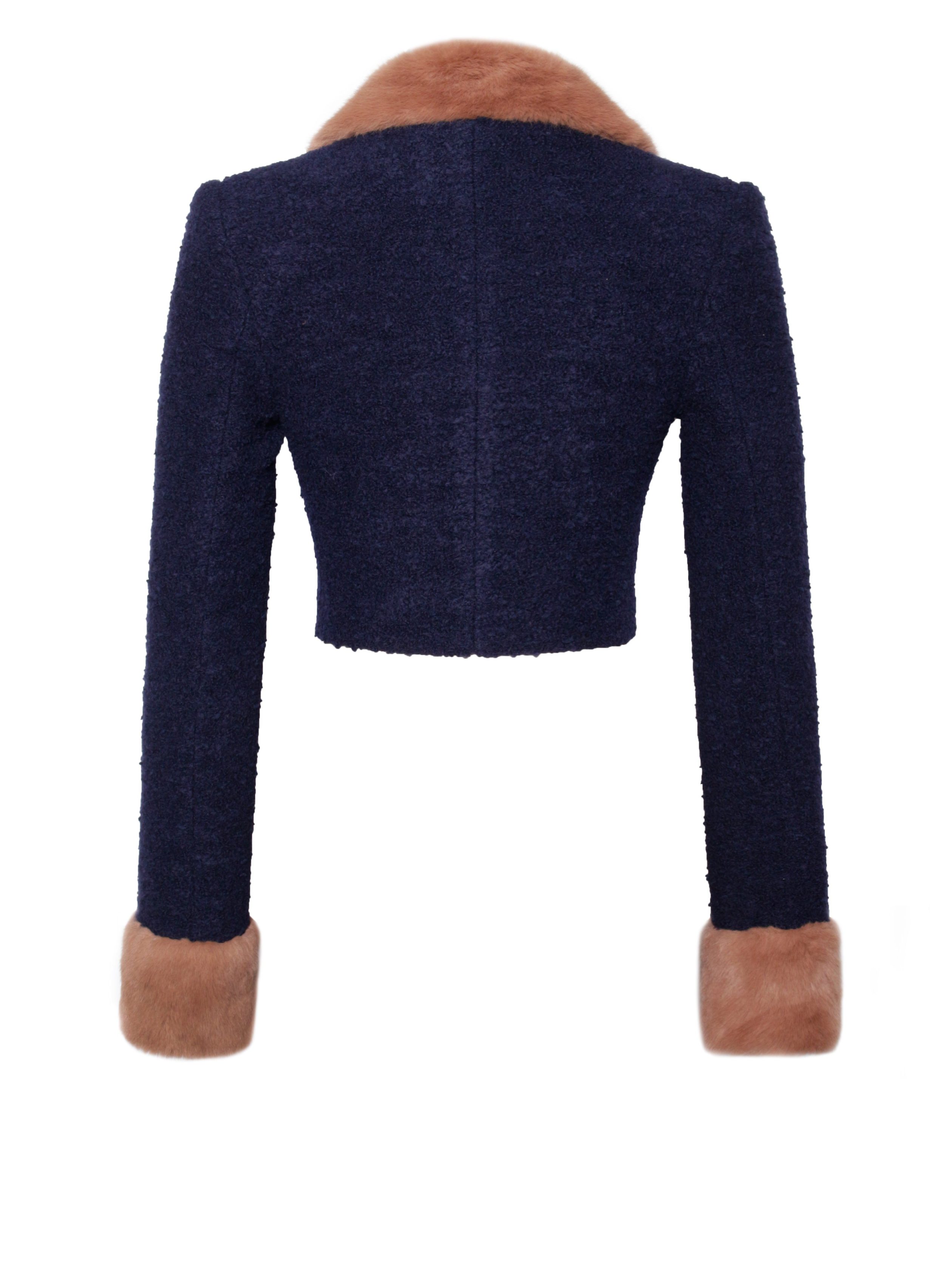 The Wava Top is a sophisticated piece that merges elegance with modern flair. Made from a rich navy blue wool blend boucle. this double-breasted cropped jacket features a chic pinkish brown vegan fur lapel collar and cuffs. adding a luxurious touch. The structured shoulder pads enhance the silhouette. while the fully lined interior ensures comfort and style. Perfect for layering over dresses or pairing with high-waisted bottoms. the Wava top is a versatile addition to any wardrobe. It pairs perfectly with the .