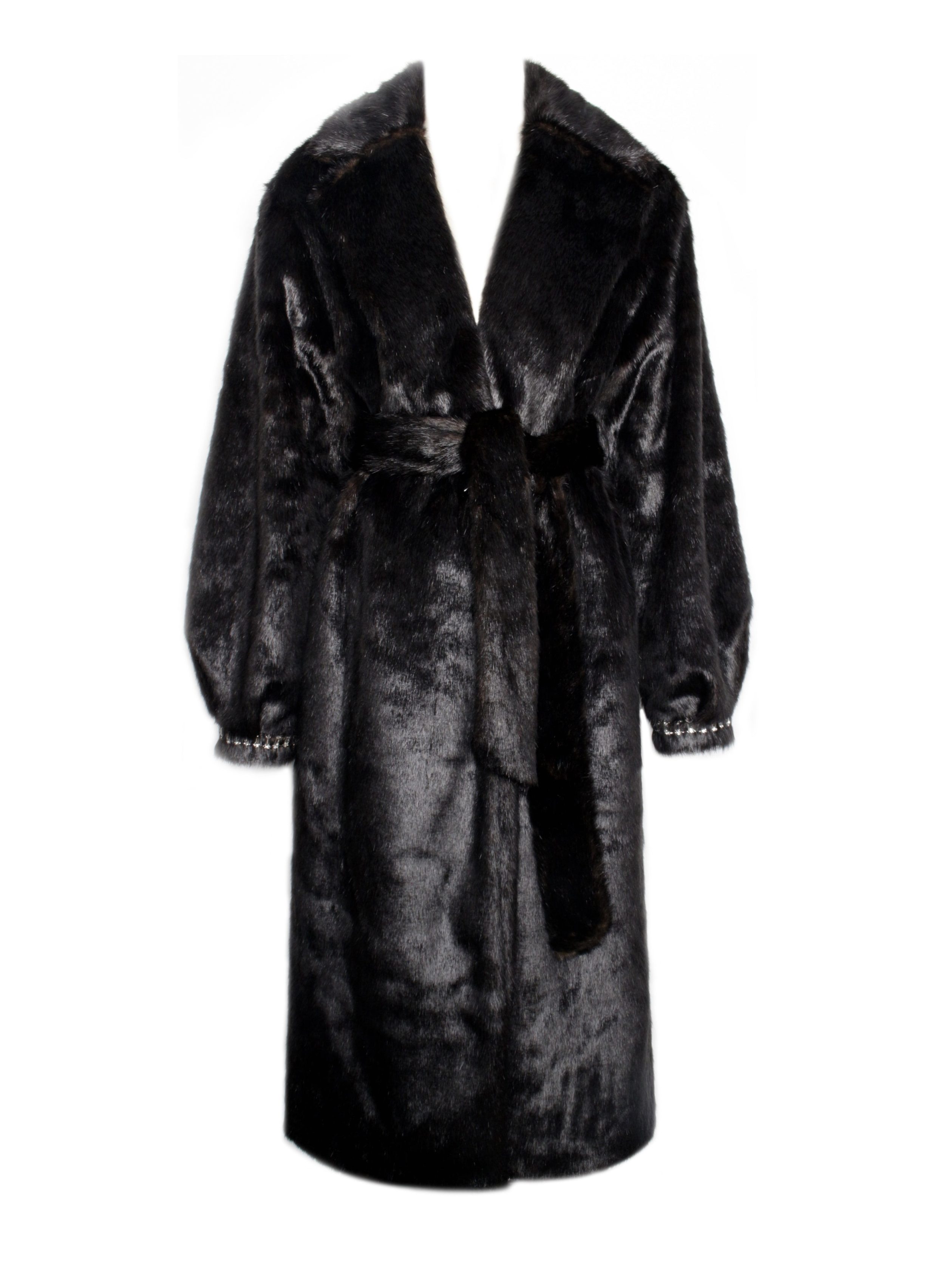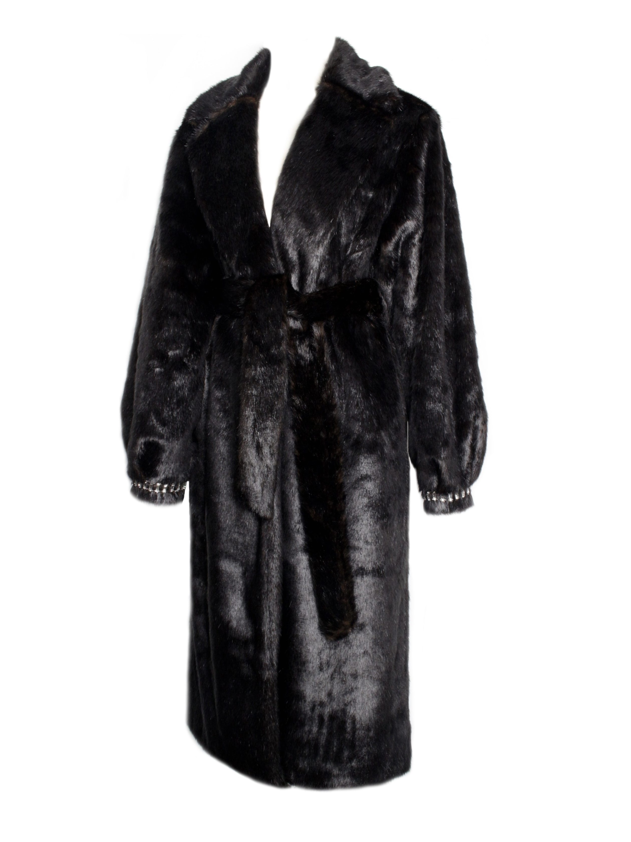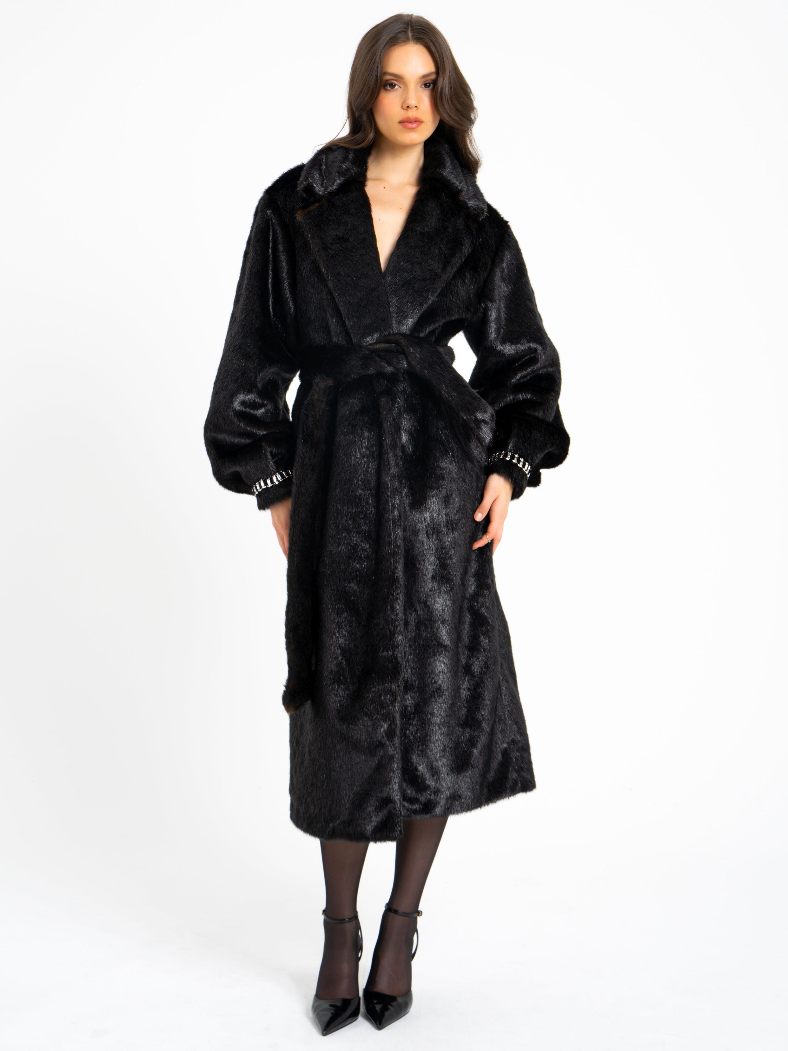 Introducing the Yahia?Coat. a luxurious and timeless piece designed to make a statement. Crafted from soft vegan otter fur. this maxi coat offers both warmth and style. The elegant notch lapel collar and crystal-trimmed cuffs add a touch of glamour. while the matching belt cinches the waist for a flattering silhouette. Thoughtfully designed with convenient pockets. this coat combines functionality with high-end fashion. making it the perfect addition to your winter wardrobe.