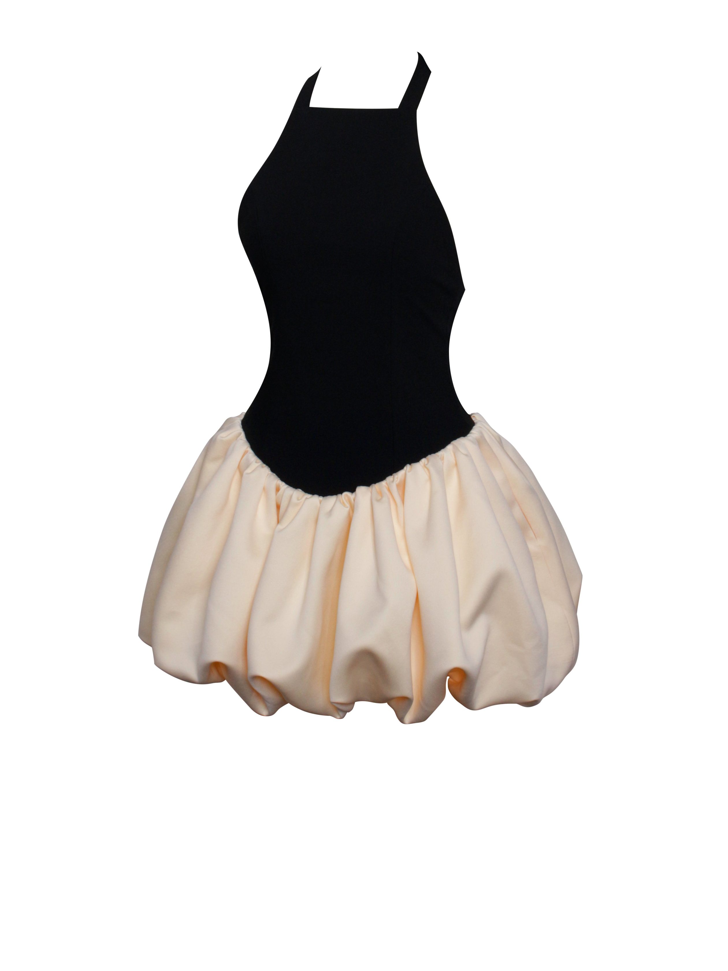 Introducing our Yaira dress. a stunning blend of elegance and modern design. Featuring an adjustable halter neckline that can be tied into a chic bowtie. this dress offers versatile styling options. The bubble skirt design. supported from within. creates a flattering silhouette. while the backless feature adds a daring touch. Crafted in a sophisticated contrast of beige satin and black stretch crepe. it seamlessly combines classic and contemporary elements. An invisible zipper ensures a flawless finish. and the discreet invisible pocket adds practical functionality. Perfect for any special occasion. this dress effortlessly merges style and sophistication.