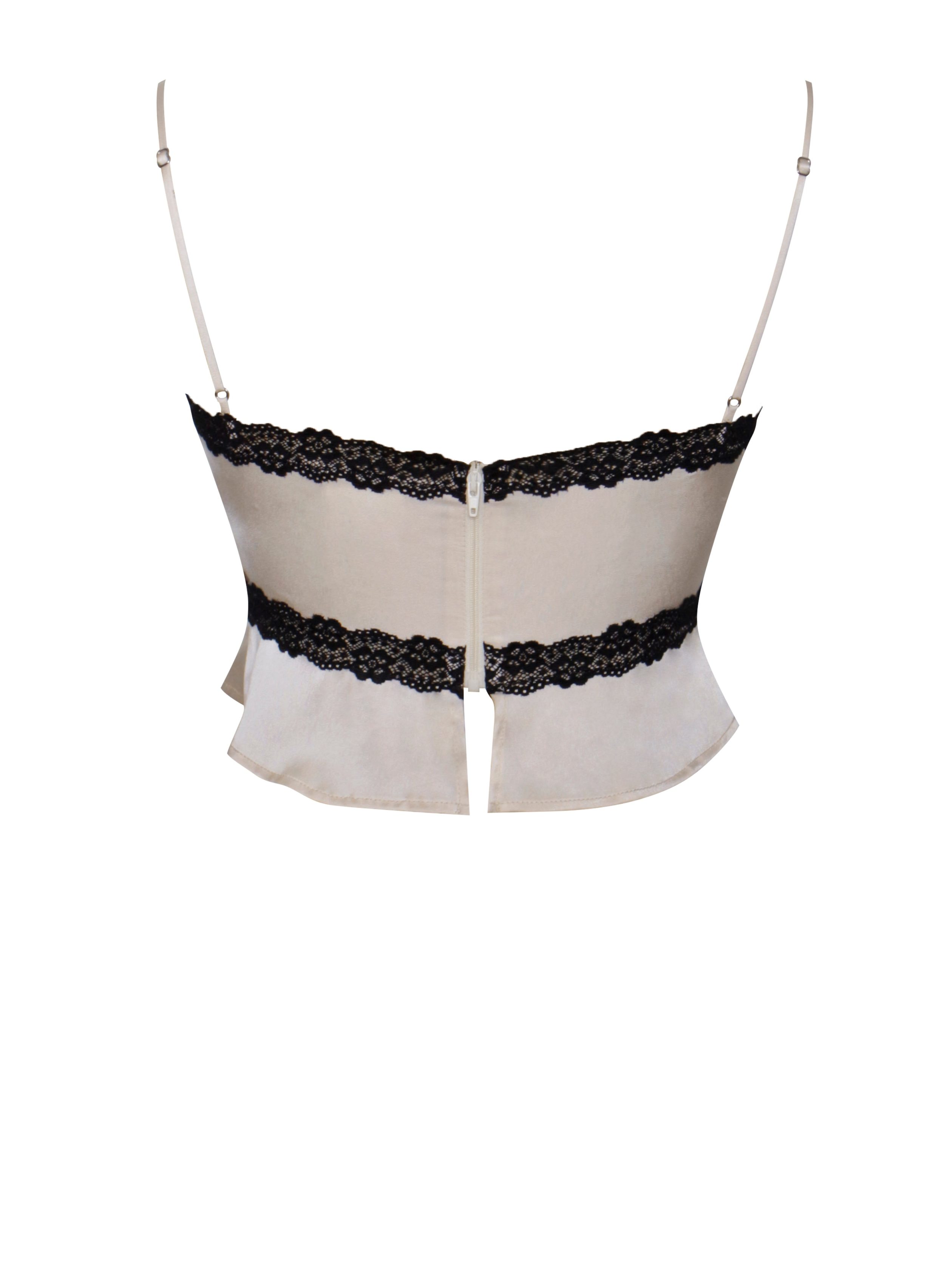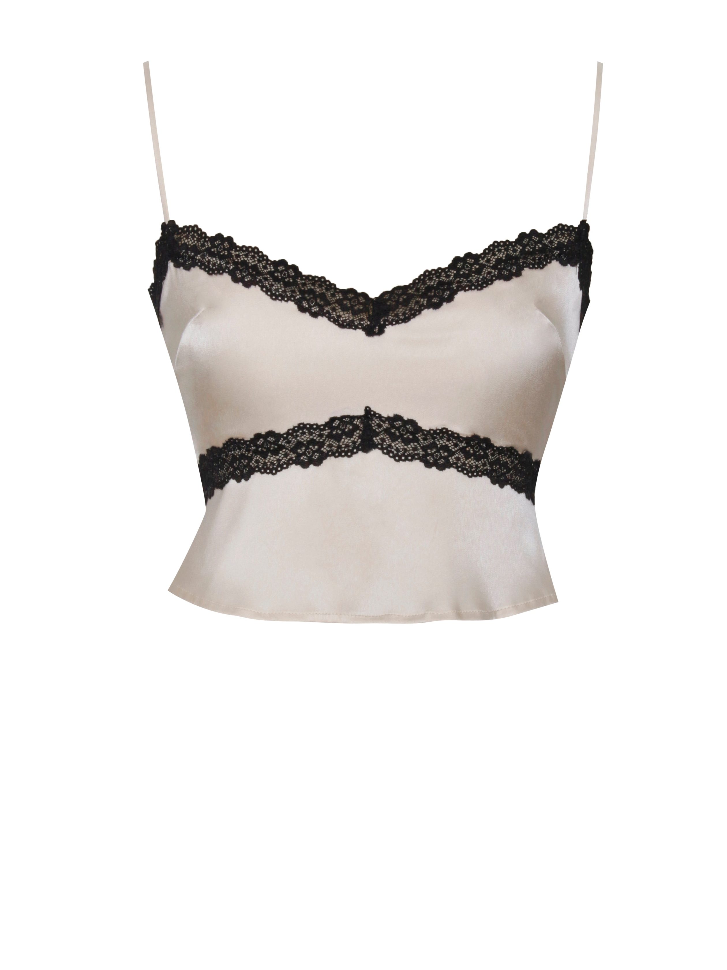 Elevate your look with the Yareli Beige Lace Trim Satin Strappy Top. This stunning sweetheart neckline crop top. in elegant beige. features contrasting black lace detailing for a touch of sophistication. Crafted from soft double duchess satin. this design is fully lined and boasts thin satin spaghetti straps with adjusters. Fitted at the bust. cut on the bias for a slight flare. and adorned with a small exposed zipper at the center back. Versatile for any occasion. pair it effortlessly with the matching (sold separately) for an irresistibly chic two-piece set. Perfect for casual events. strolls in the park. nights out. vacations. holiday parties. or any special celebration.