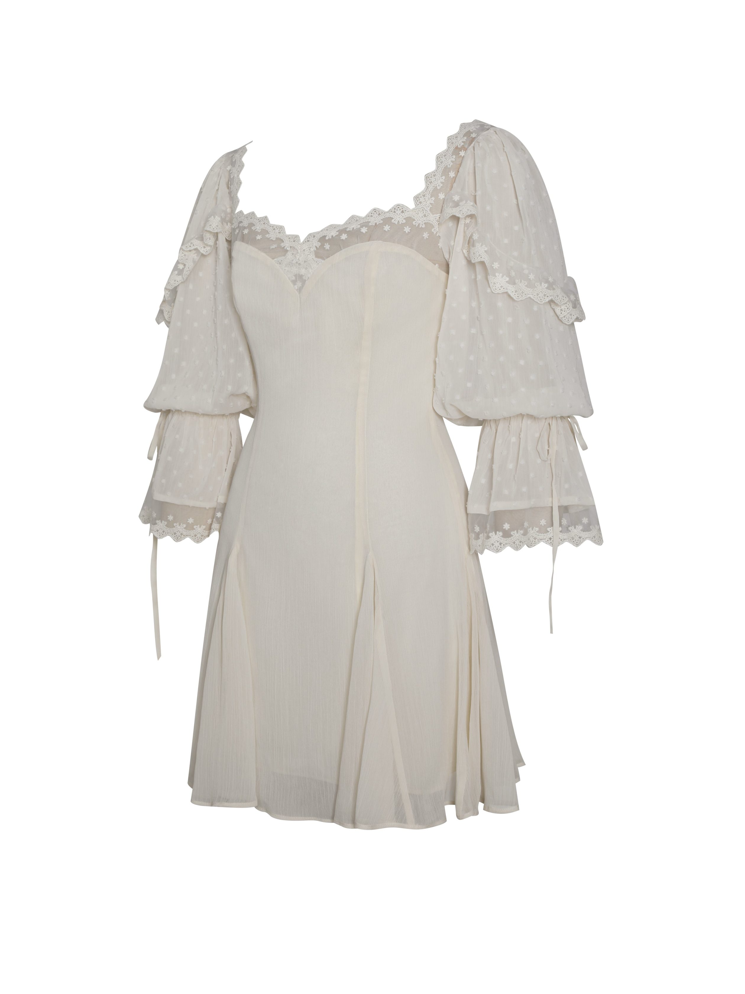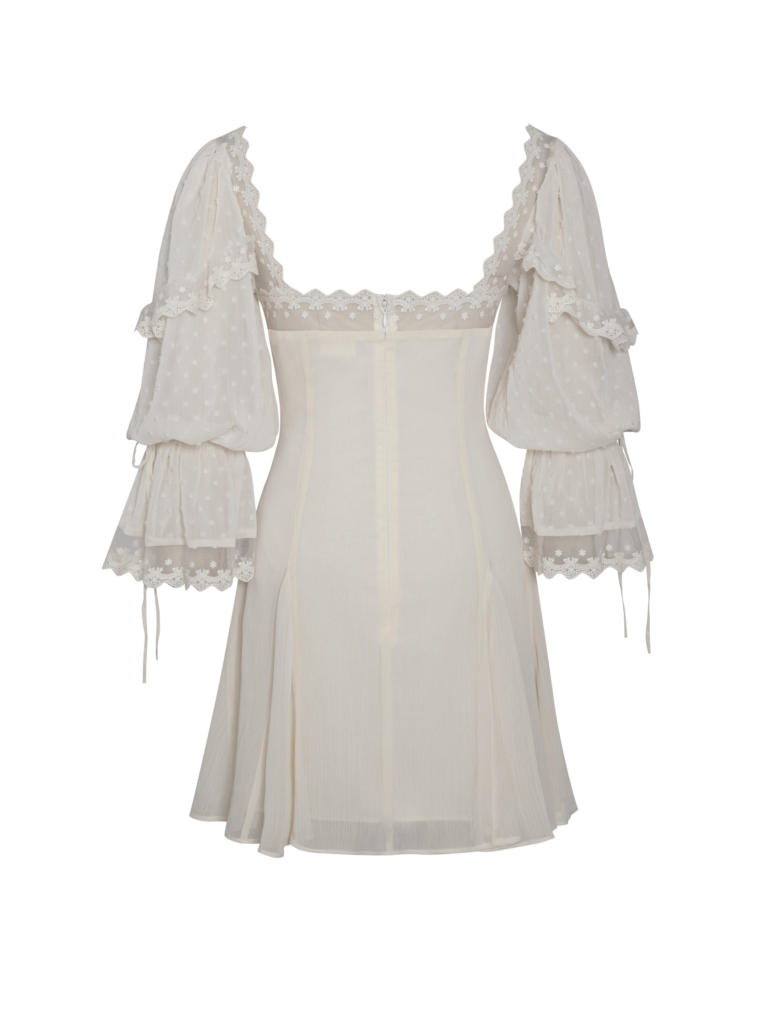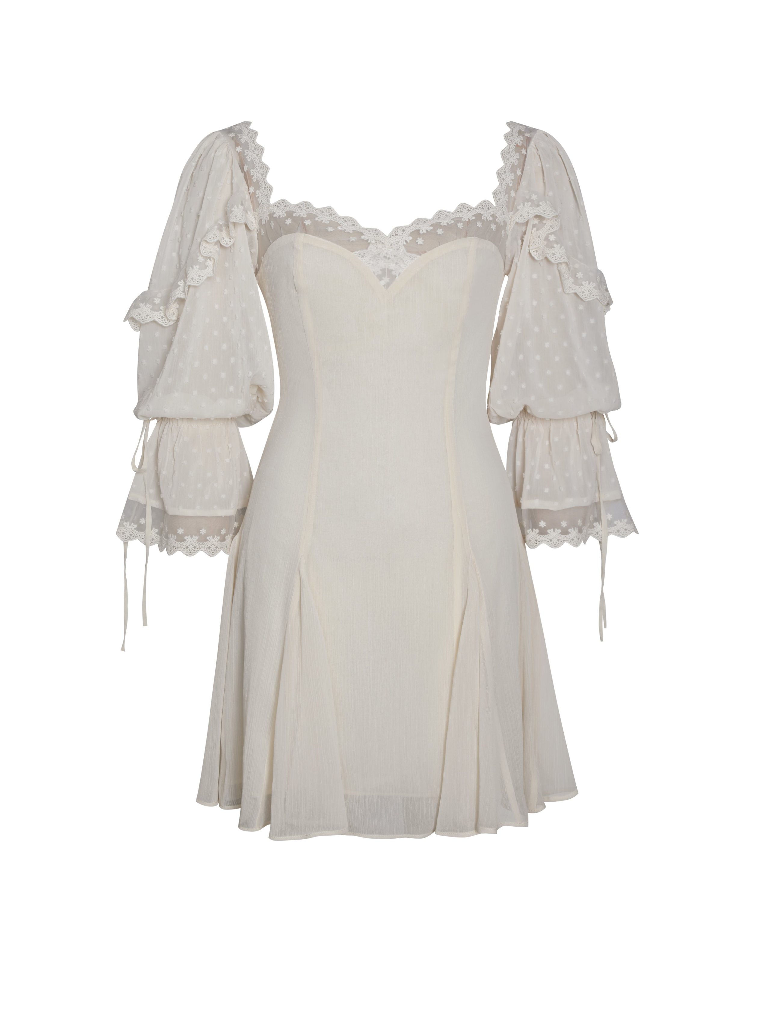 Romantic and carefree. the Zakira Dress blends boho charm with feminine elegance. Made from off-white rayon and finished with delicate sheer lace trim. this dreamy mini features a soft sweetheart neckline. voluminous balloon sleeves with flared cuffs. and a flared skirt that moves with every step. Fully lined for comfort and designed with an invisible zipper for a seamless fit. it’s the perfect dress for holiday escapes. sunlit vacations. and whimsical summer days.